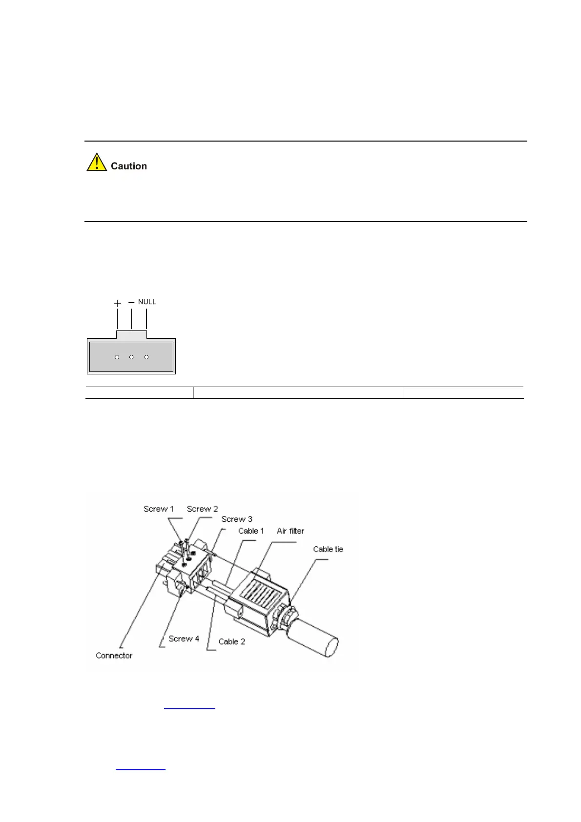 z As shown in Figure 3-28, pass the two power cables through the air filter, insert them into the