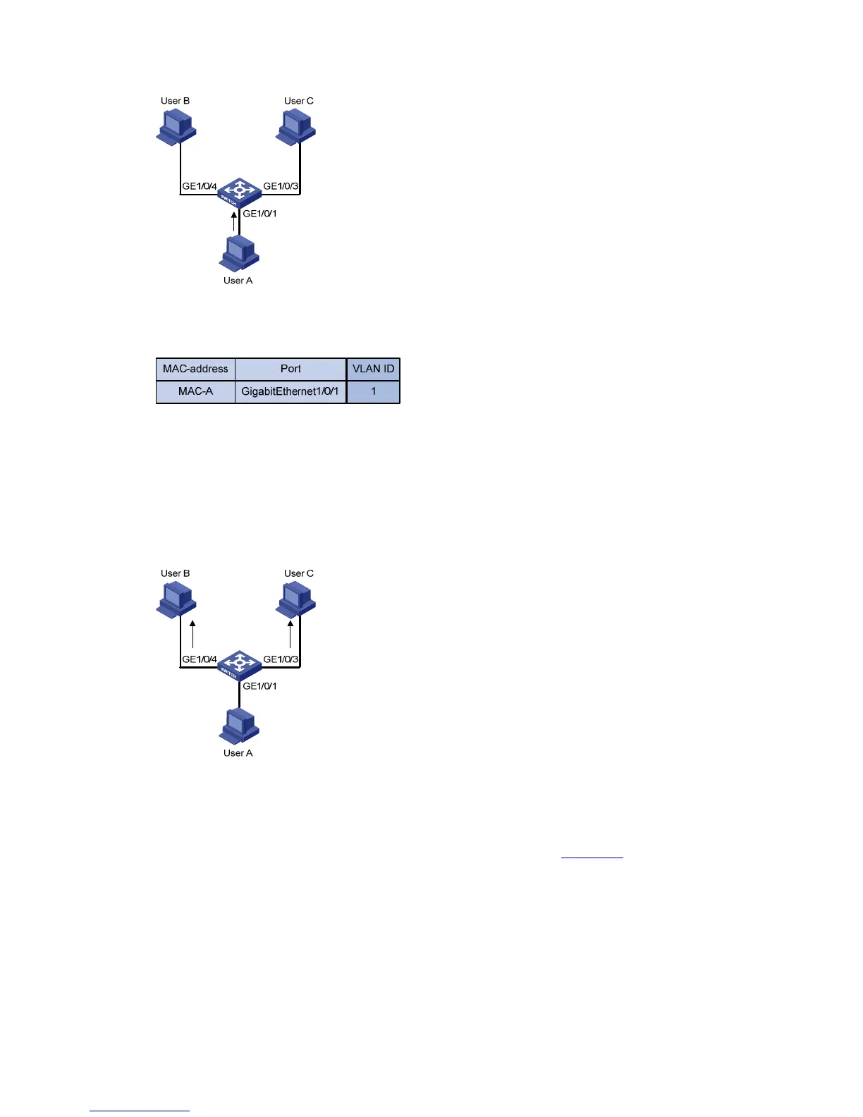 2) After learning the MAC address of User A, the switch starts to forward the packet. Because there is