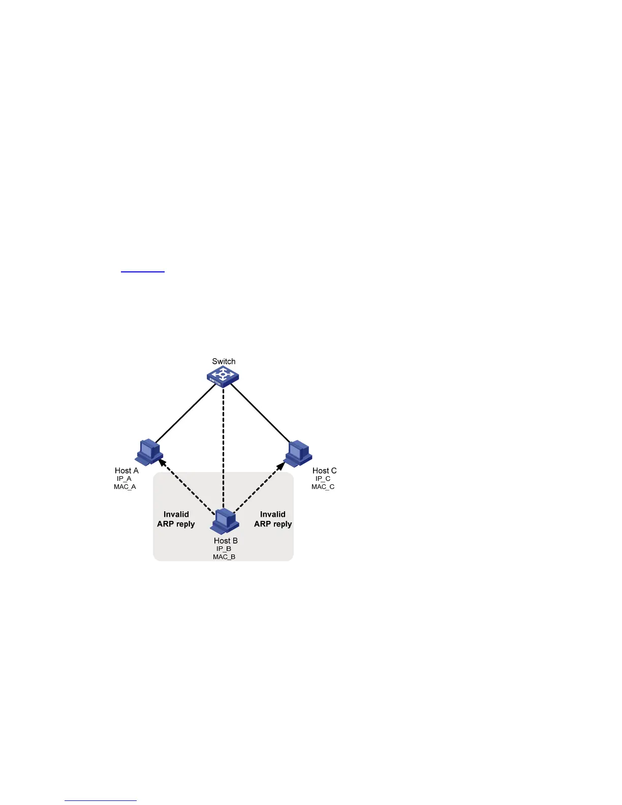 A and Host C, the hacker (Host B) forwards invalid ARP reply messages to Host A and Host C
