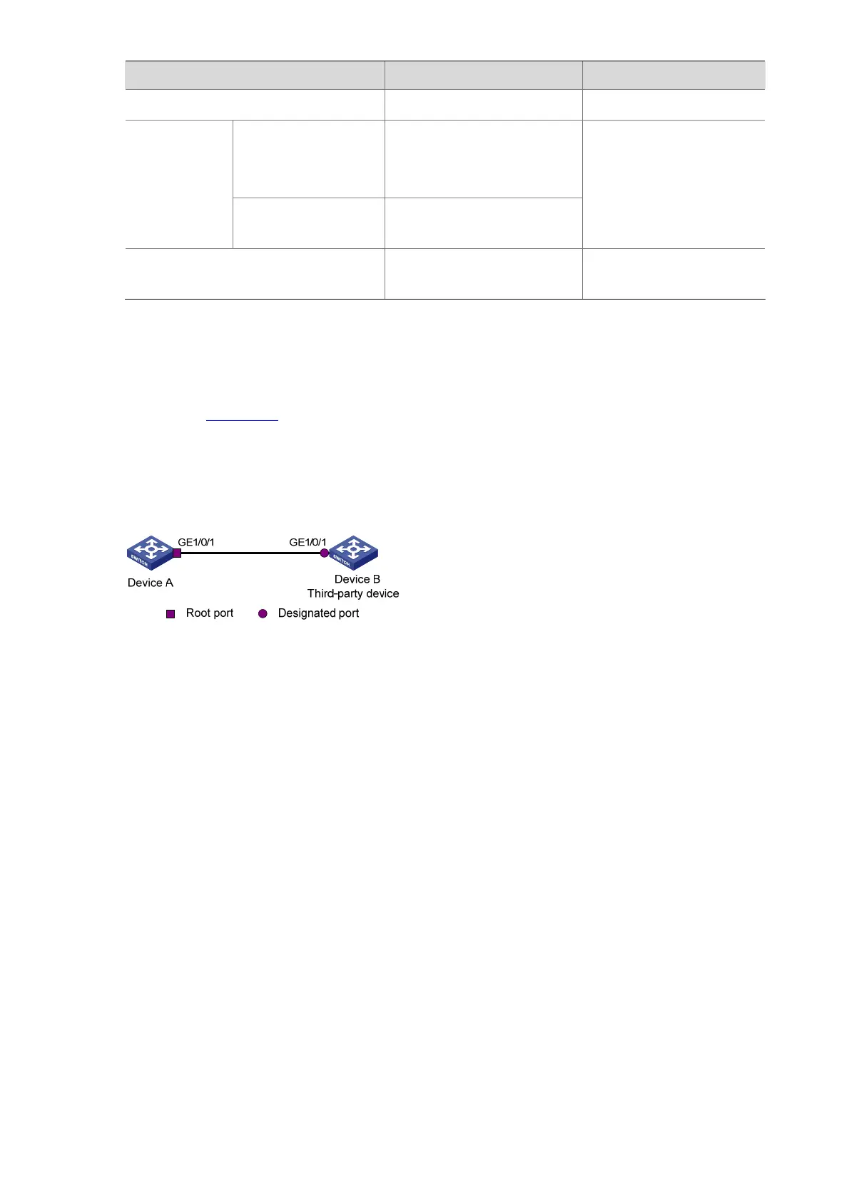 z Device A connects to Device B, a third-party device that has different MSTP implementation. Both