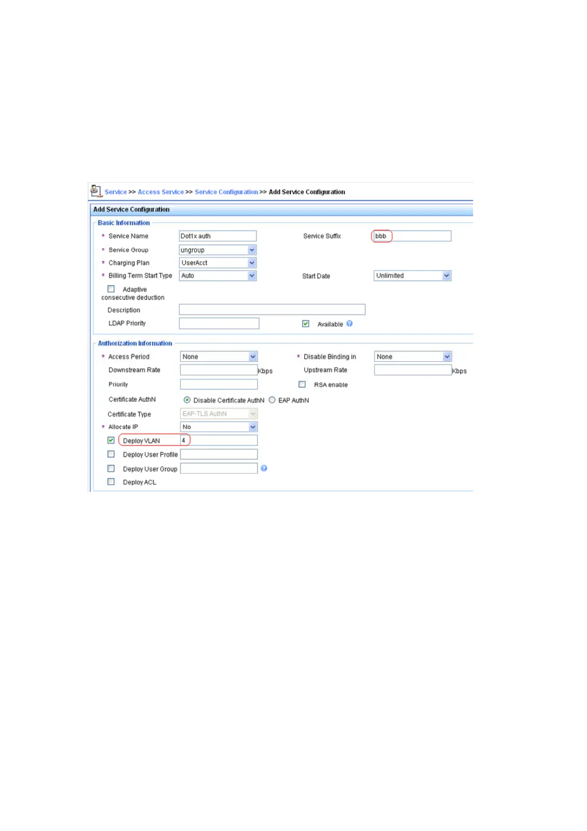 z Add a service named Dot1x auth and set the Service Suffix to bbb, which indicates the