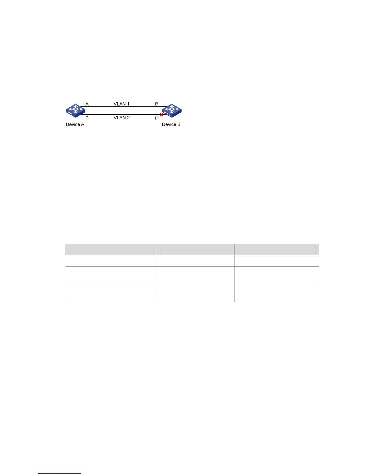 traffic of VLAN2 to pass through; port B on Device B allows the traffic of VLAN 1 to pass through, and