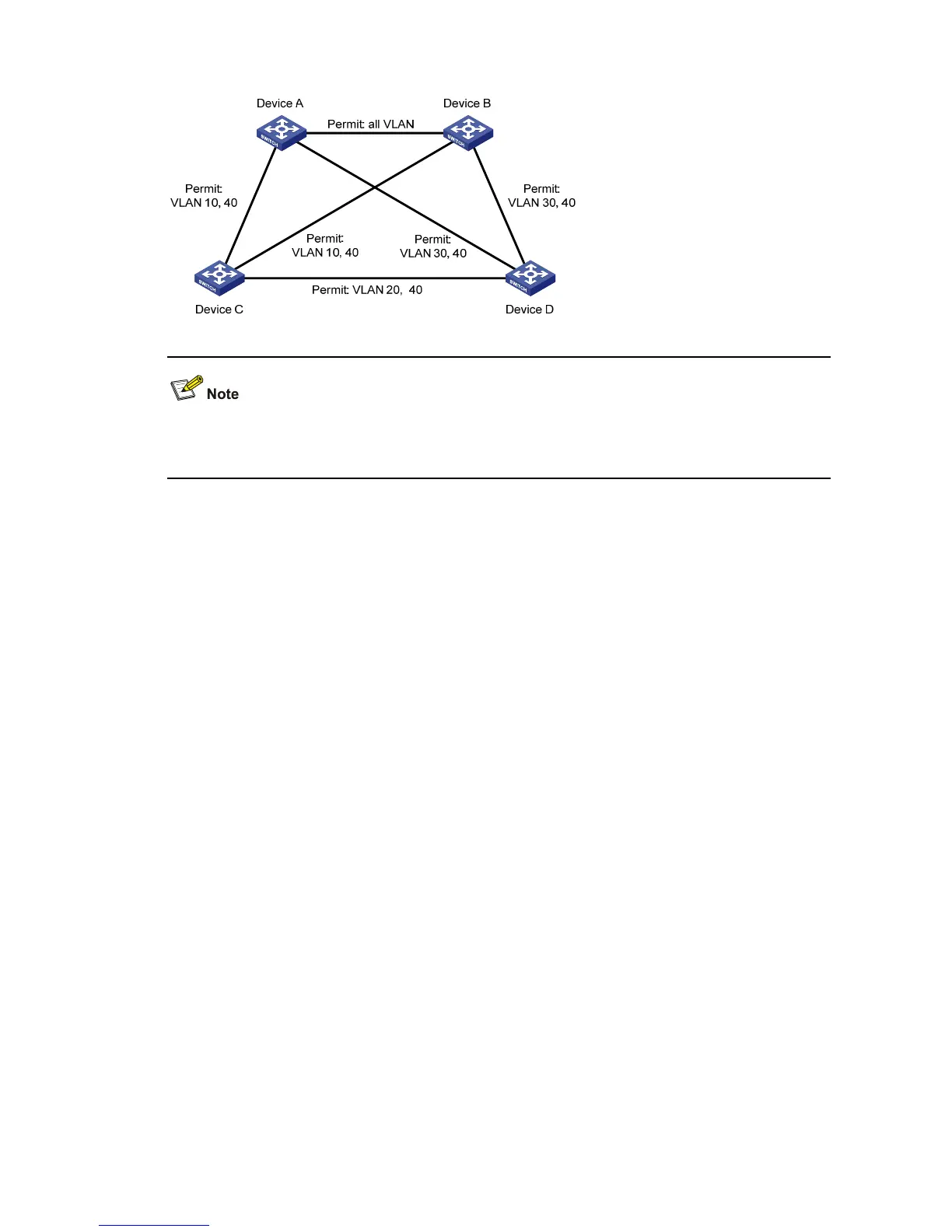 “Permit:“ beside each link in the figure is followed by the VLANs the packets of which are permitted to