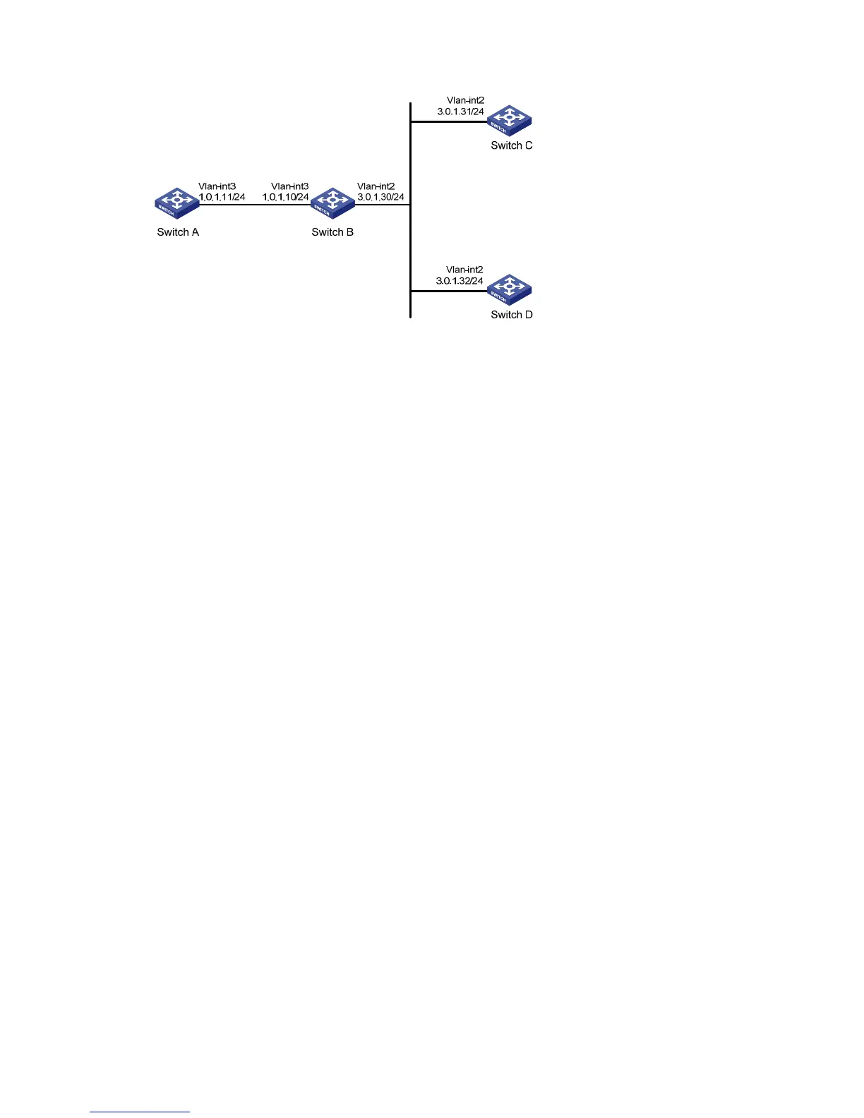 broadcast messages through VLAN-interface 2. Upon receiving a broadcast message from Switch C,