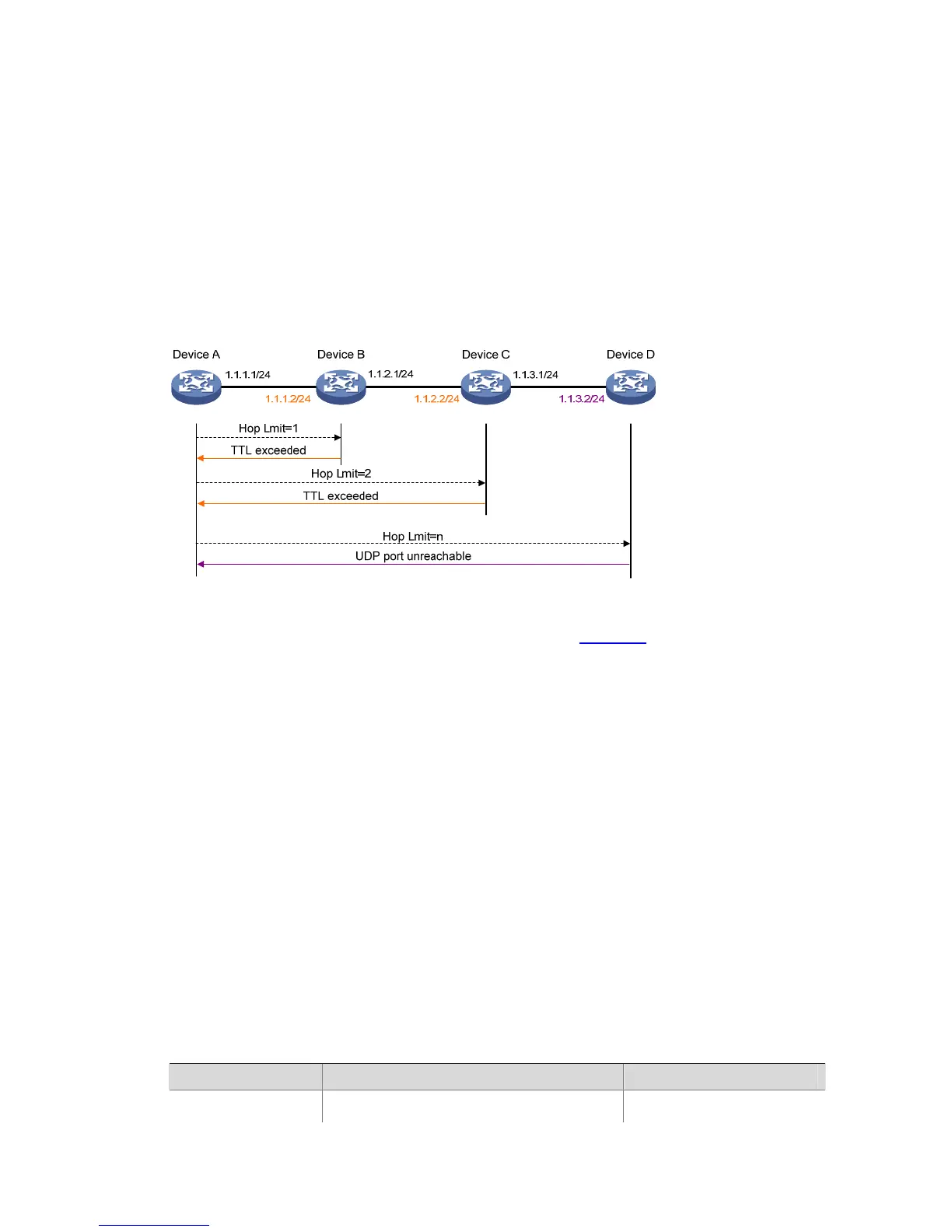 1) The source (Device A) sends a packet with a TTL value of 1 to the destination (Device D). The UDP