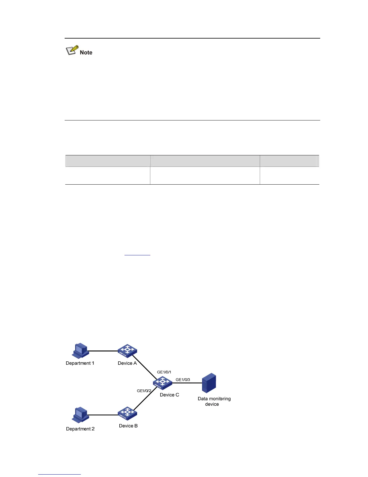 z Department 1 is connected to port GigabitEthernet 1/0/1 of Device C through Device A.
