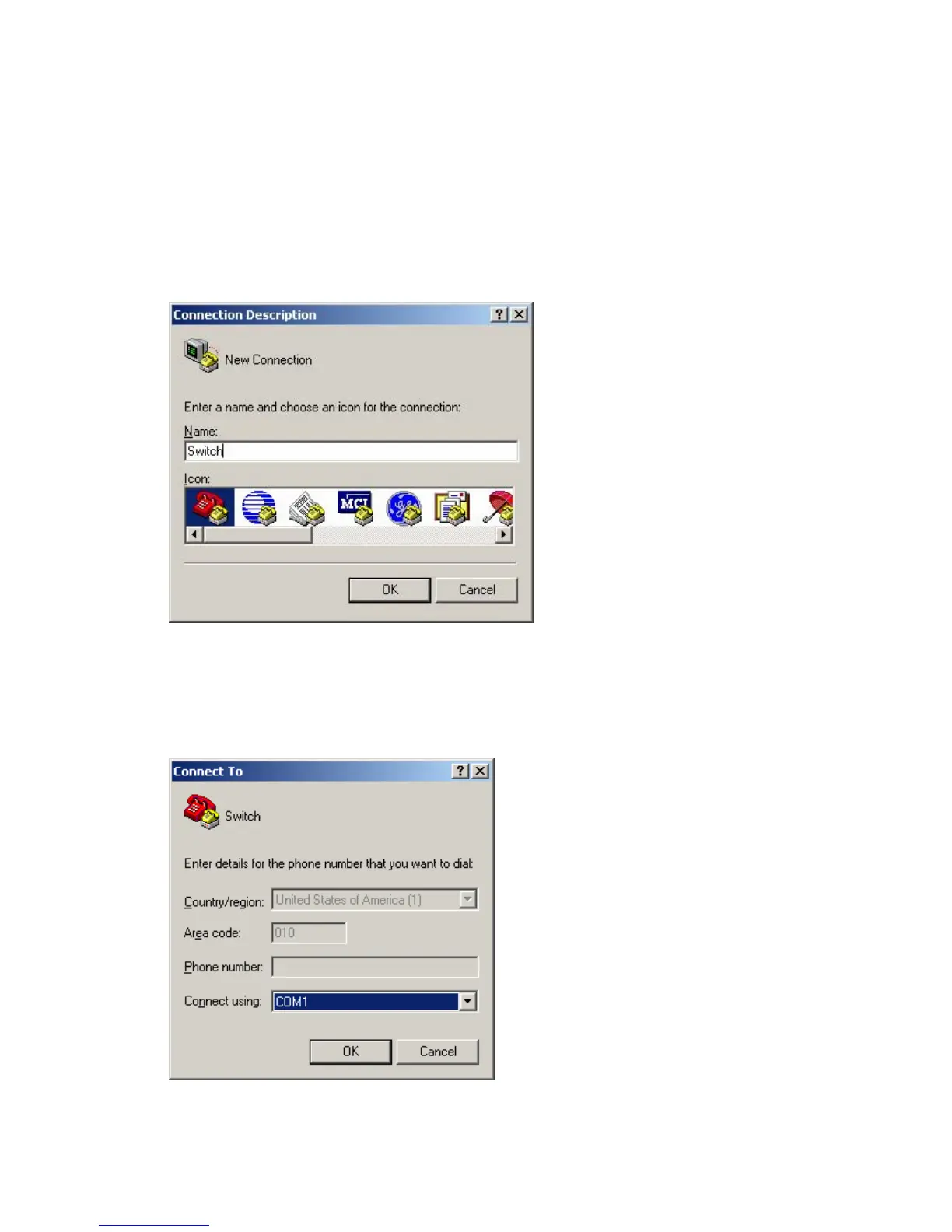 HyperTerminal window. The Connection Description dialog box appears, as shown below.
