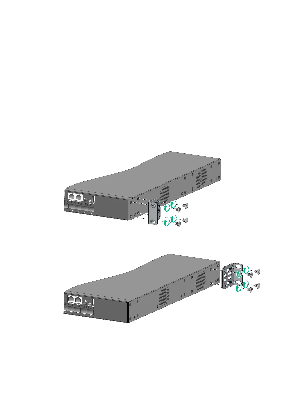 S6520X-26C-SI, and S6520X-26MC-SI switches support rack mounting by using front mounting