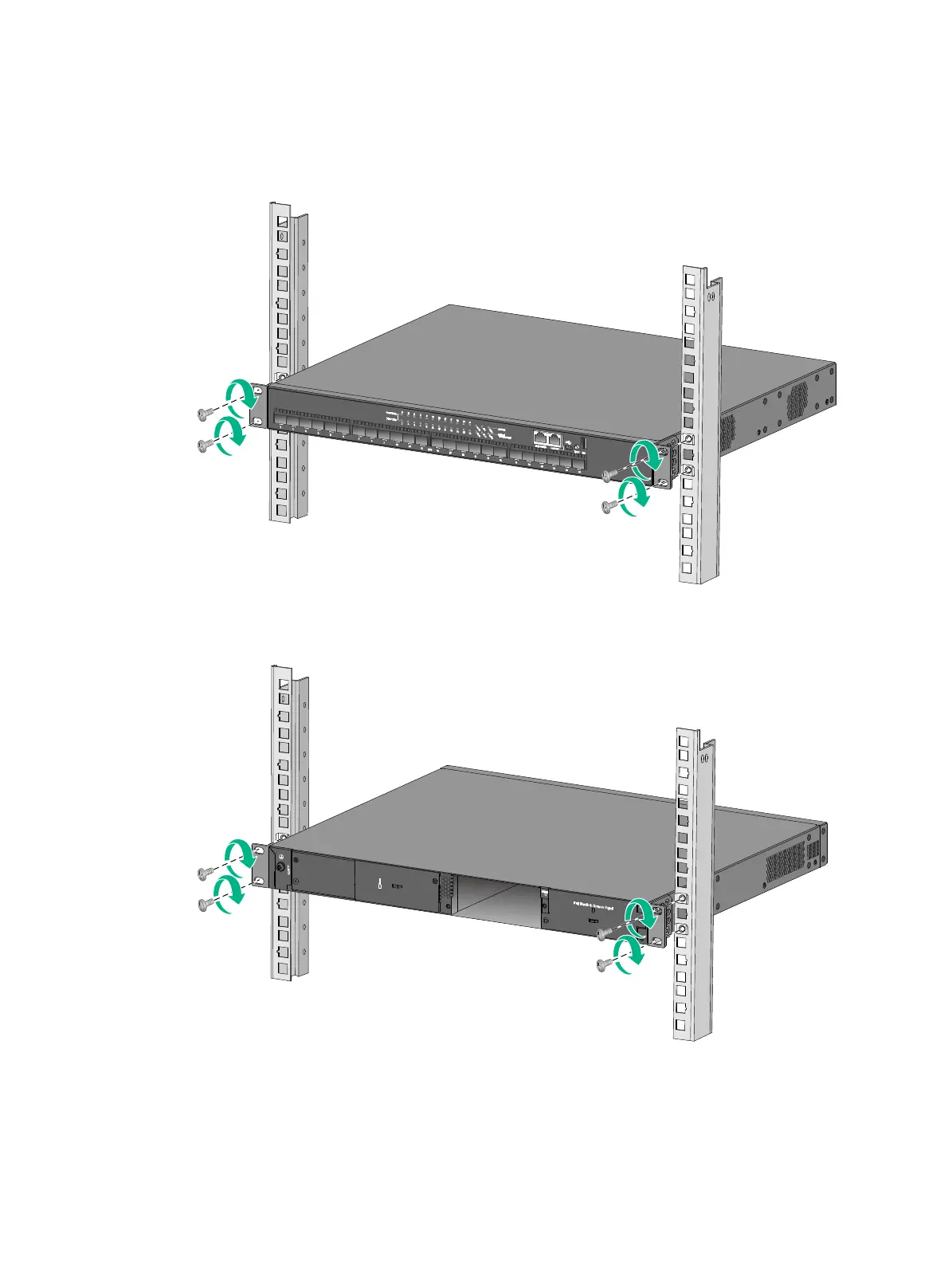3. One person holds the switch chassis and aligns the installation holes on the mounting brackets