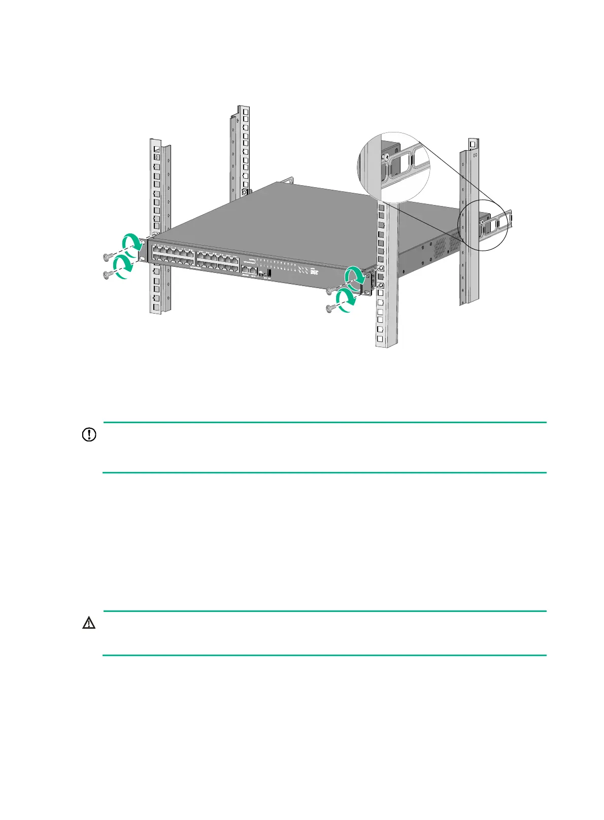 Figure 14 Mounting the switch in the rack (with the wide flange of the rear mounting brackets