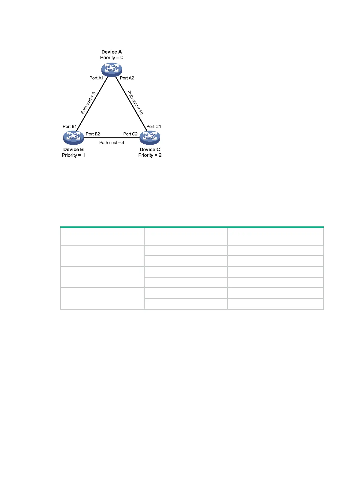 respectively. The path costs of links among the three devices are 5, 10, and 4.