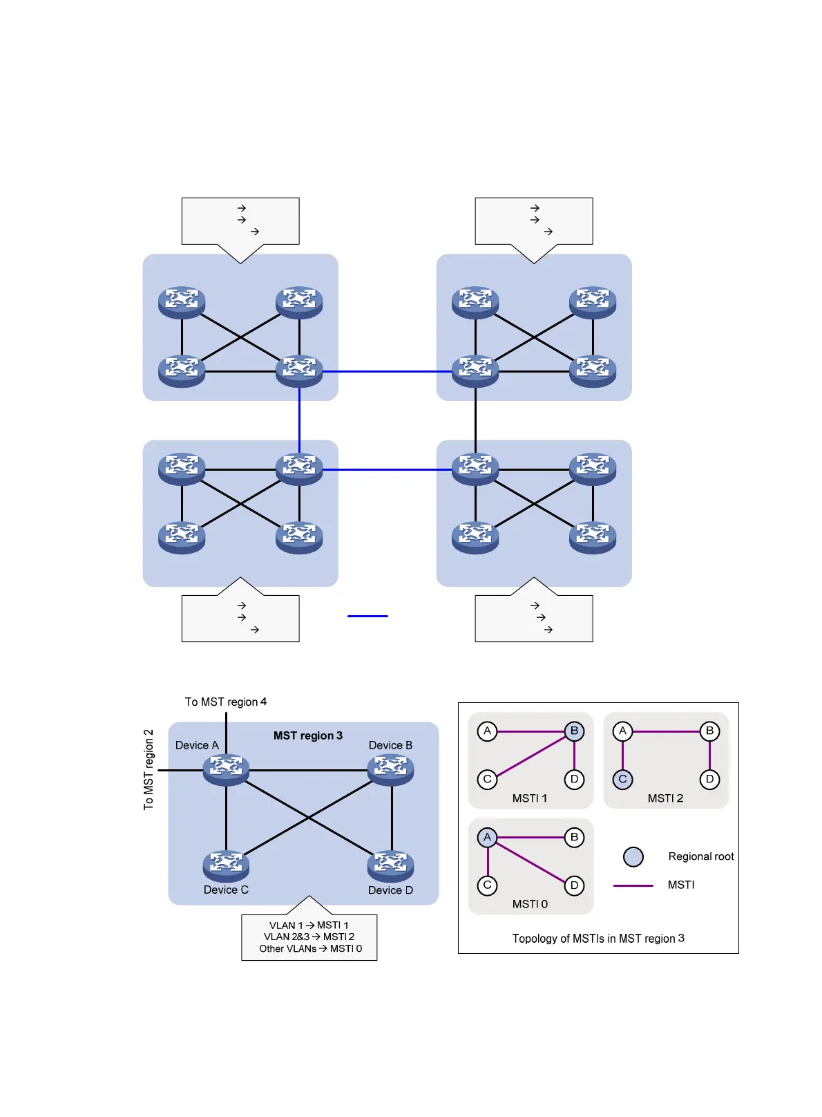 Figure 9 shows a switched network that contains four MST regions, each MST region containing four