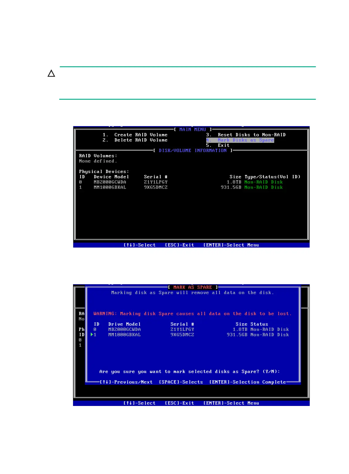 1. On the RSTe configuration screen, select Mark Disks as Spare, and press Enter.