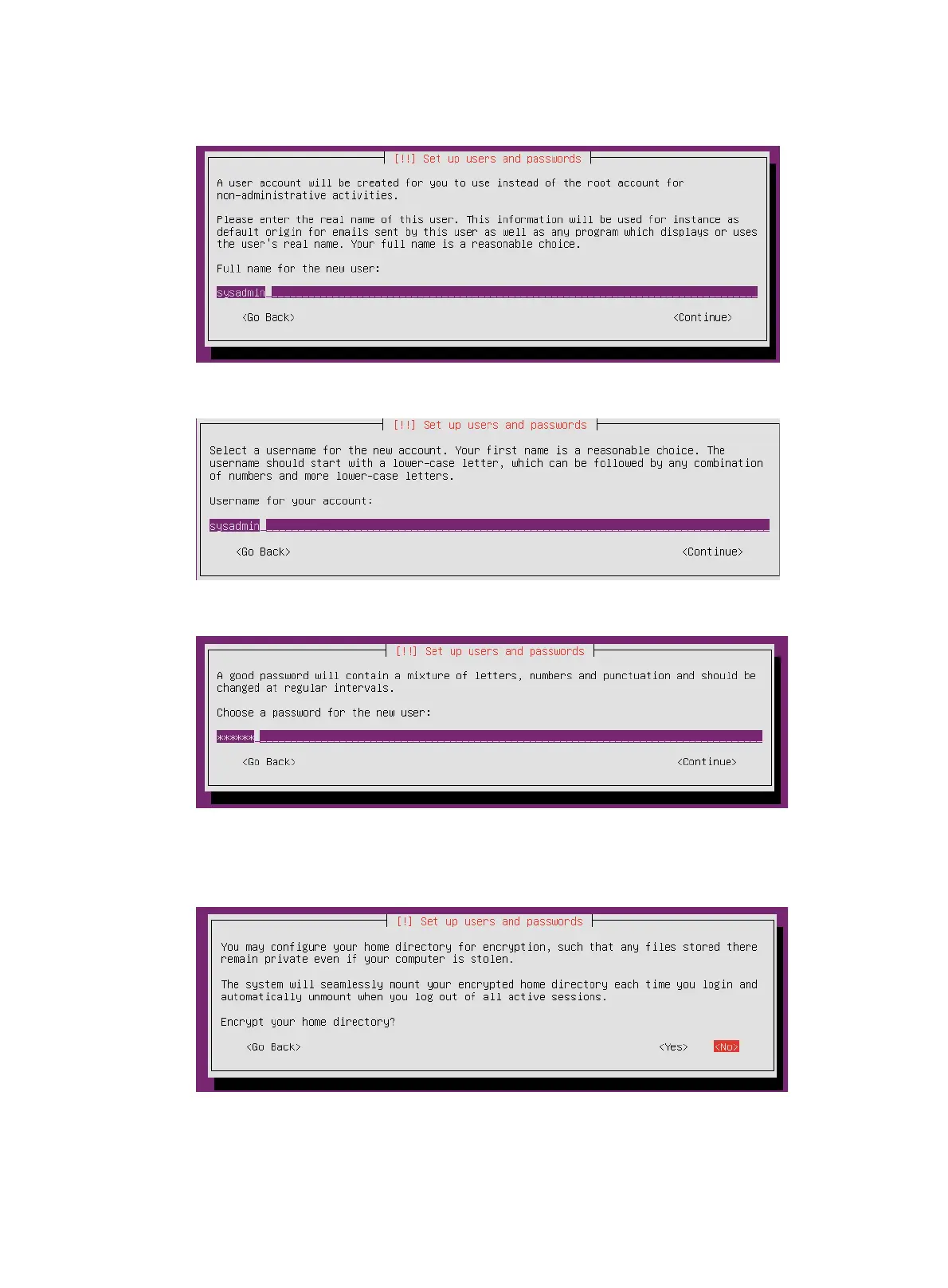 12. Configure whether to encrypt your home directory. This example selects to not encrypt the