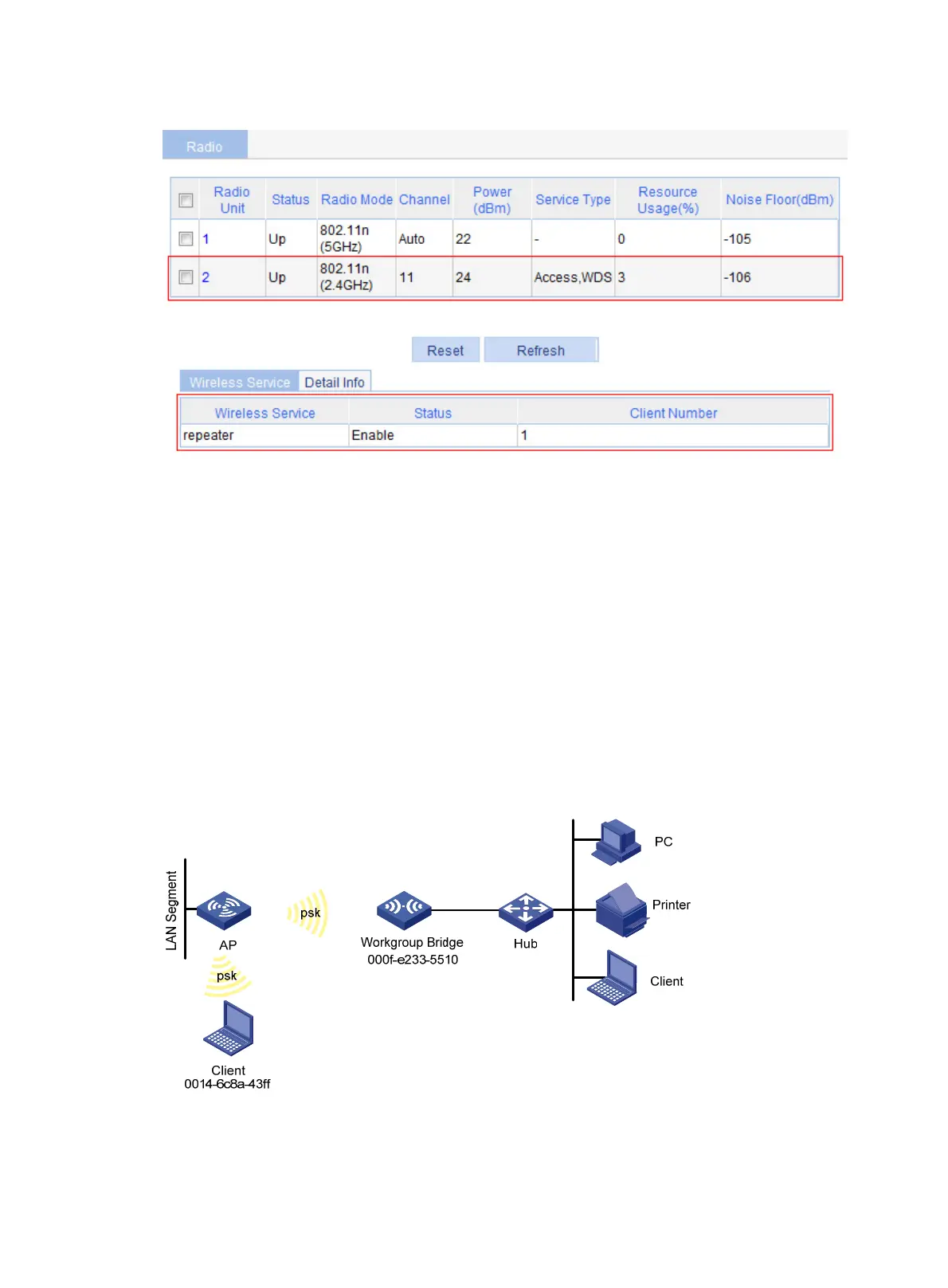 • Client with MAC address 0014-6c8a-43ff also accesses the wireless service psk.