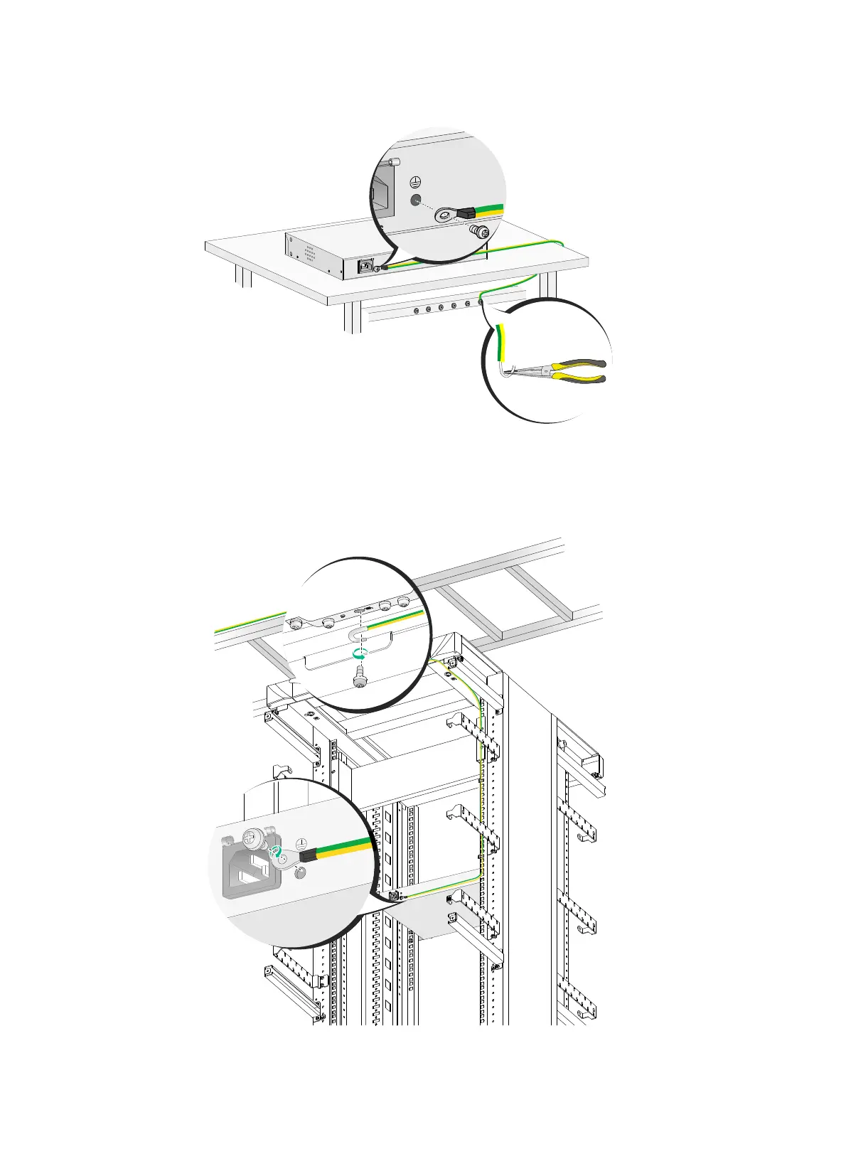 { Grounding the device with the rack—Connect the other end of the grounding cable to the