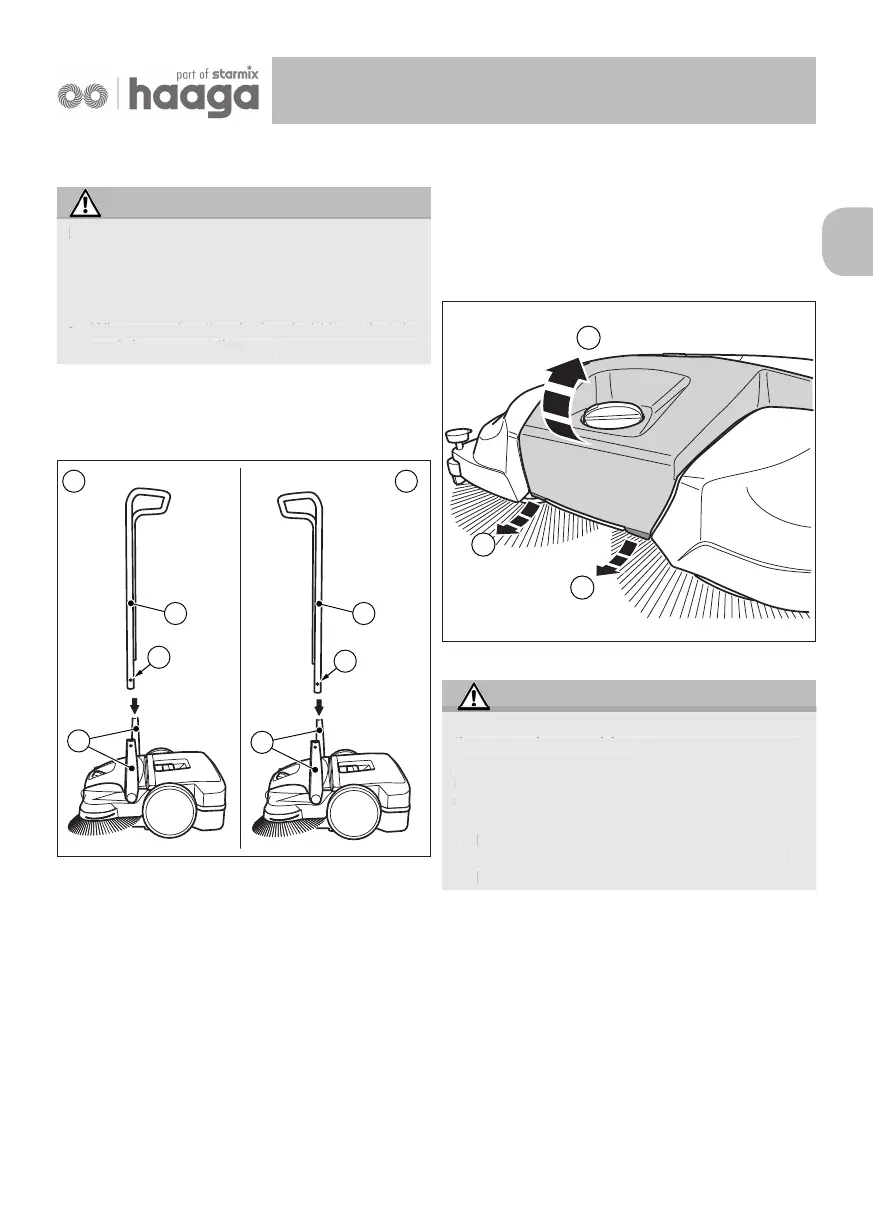 Haaga 677 - 6. Commissioning; 6.1 Install push bar; 6.2 Connect battery leads