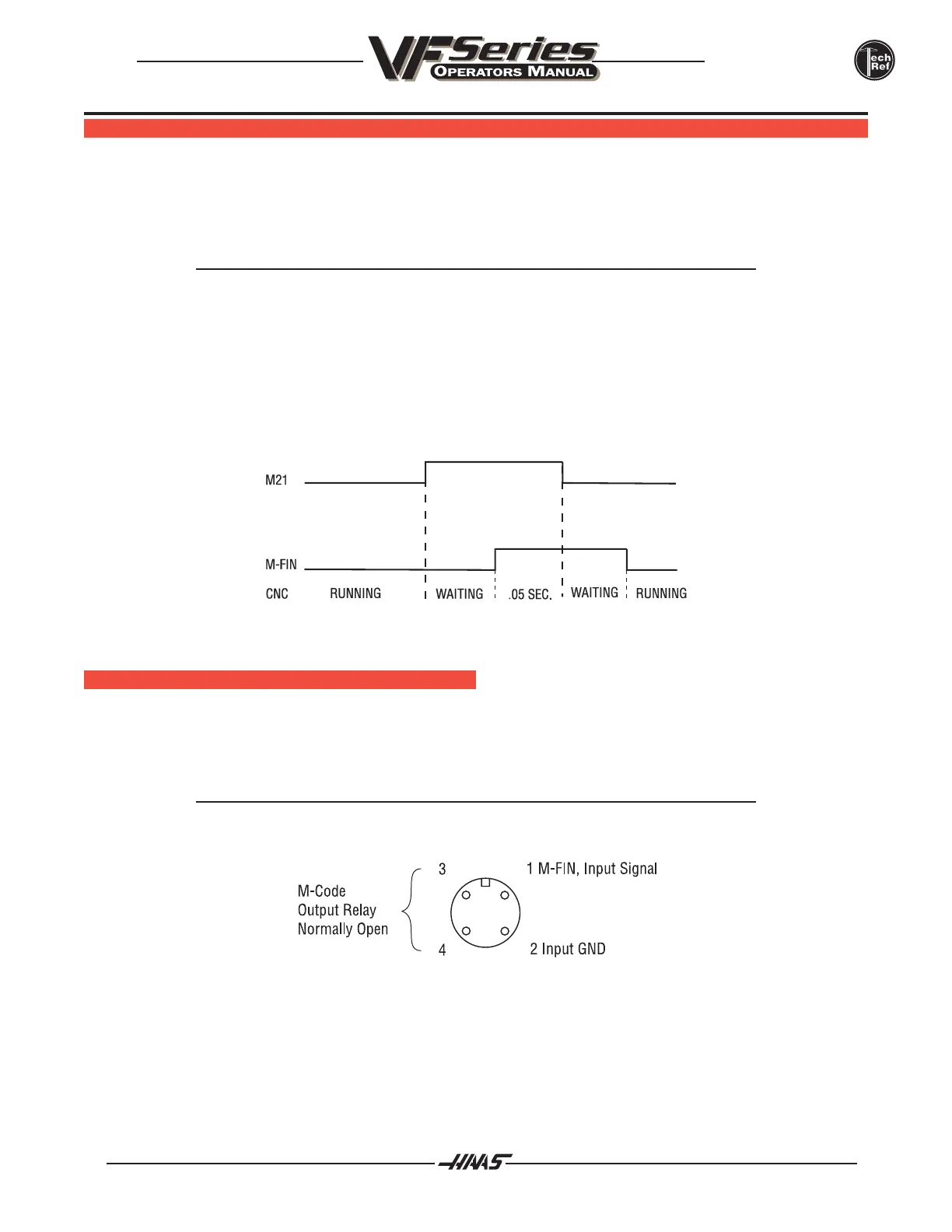 The M code interface uses outputs M21-23 and one discrete input circuit. M codes M21 through M23 will