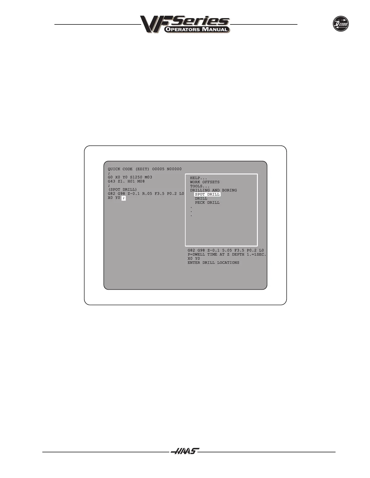 3.) Press the WRITE key to insert the code for setting up spot drilling.