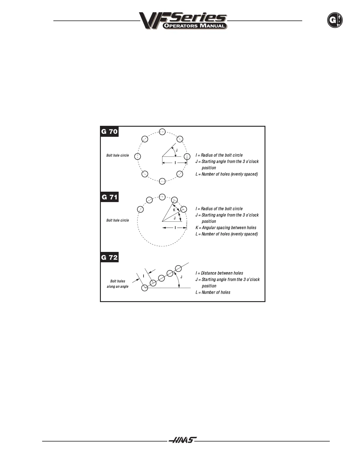 This G code drills L holes in a straight line at the specified angle. It operates similarly to G70 and G71. G72