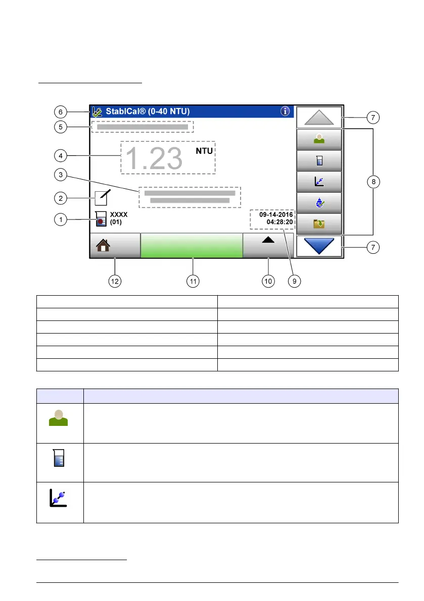 6 Calibration status icon and calibration curve 12 Home/Instrument information button