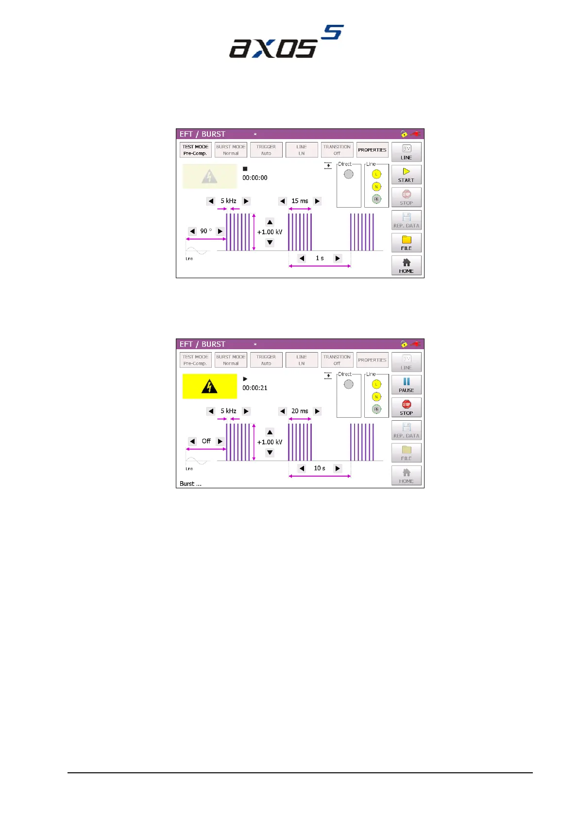 In Burst testing mode every line signal gets tested against GND (PE). In direct output the signals stands on the