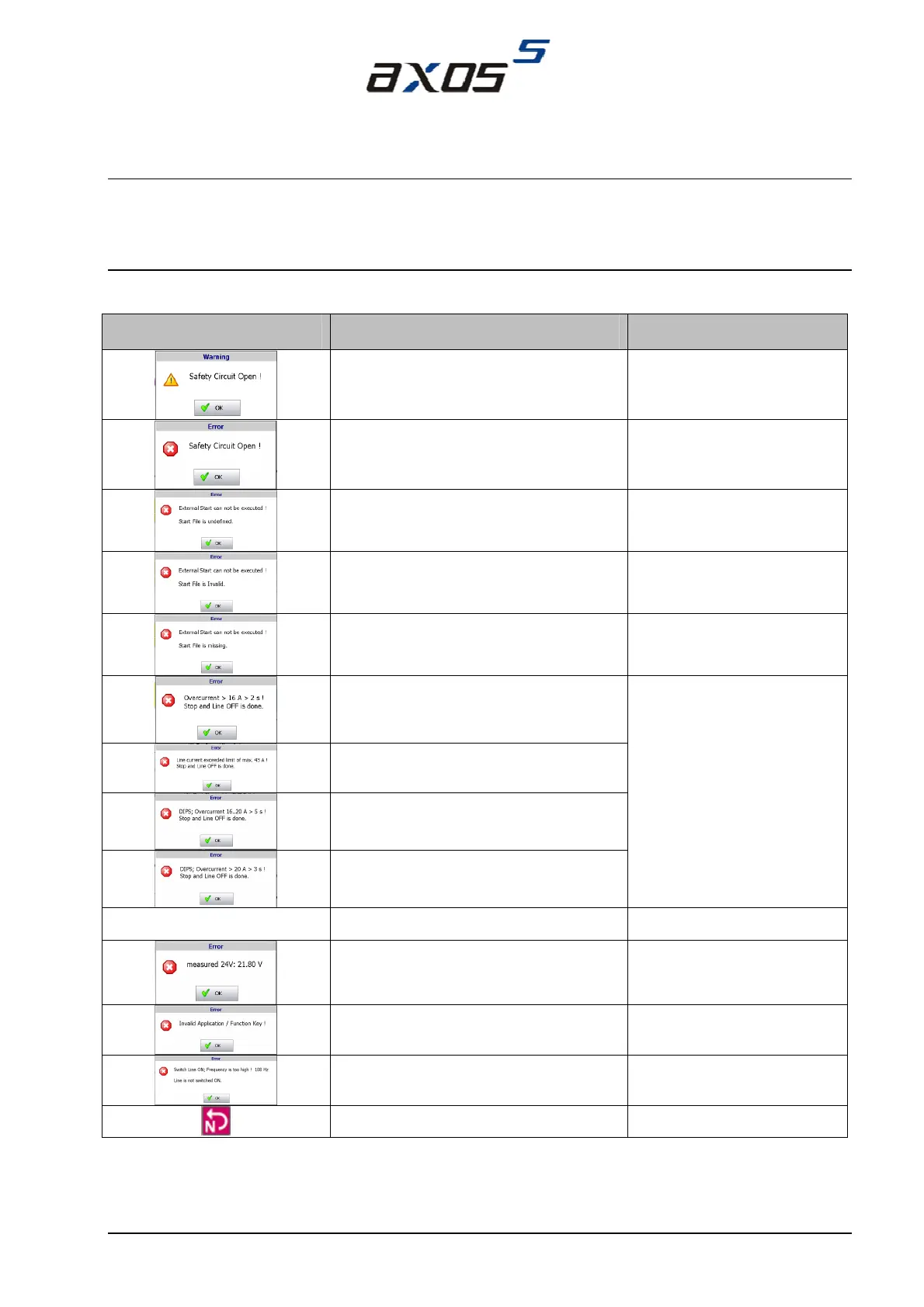 In the menu is a short summary of possible alarm messages which can occur when operating the AXOS