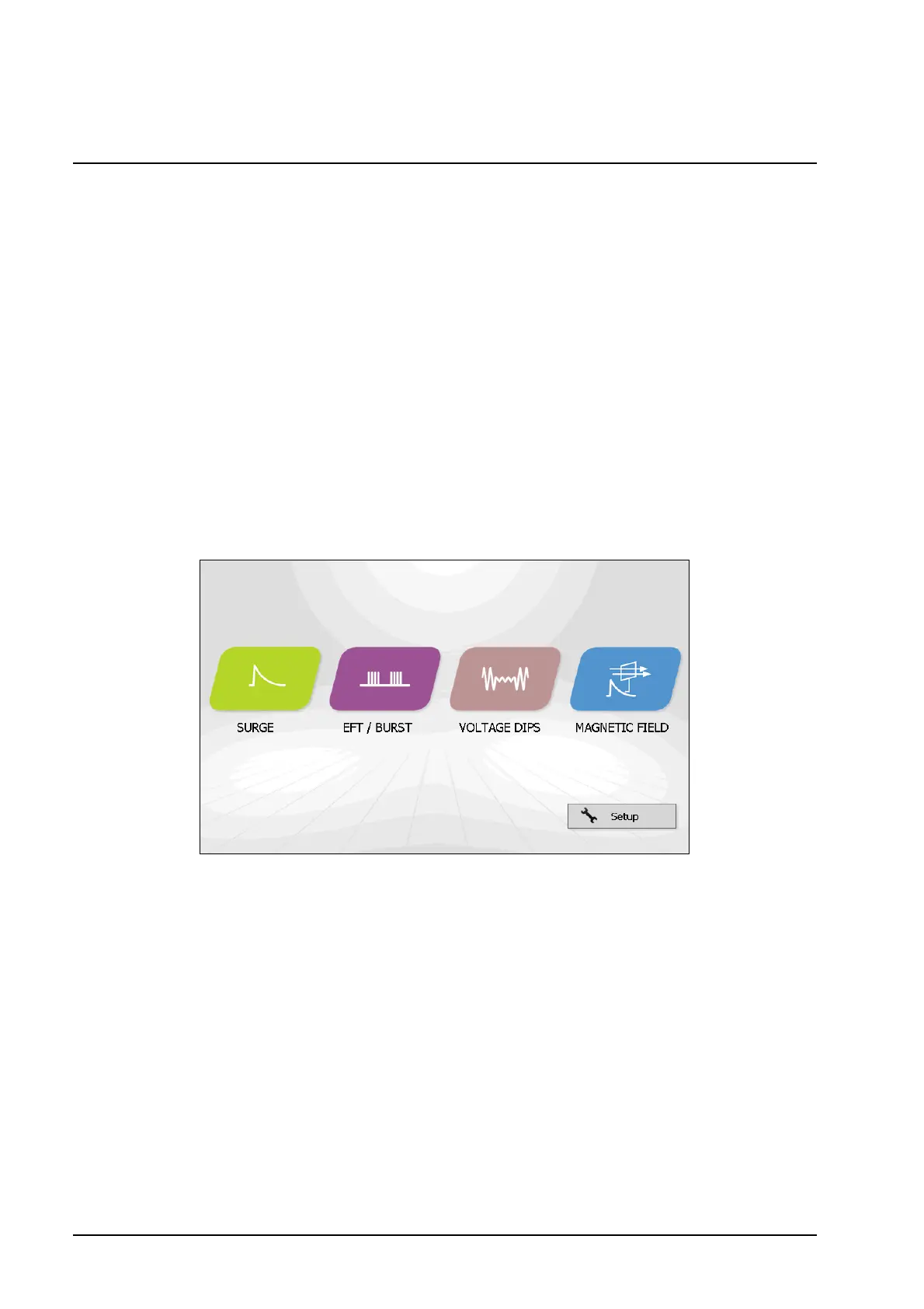 Every command is entered through the touch screen. By pressing the Surge, EFT/Burst, Voltage Dips or Magnetic field