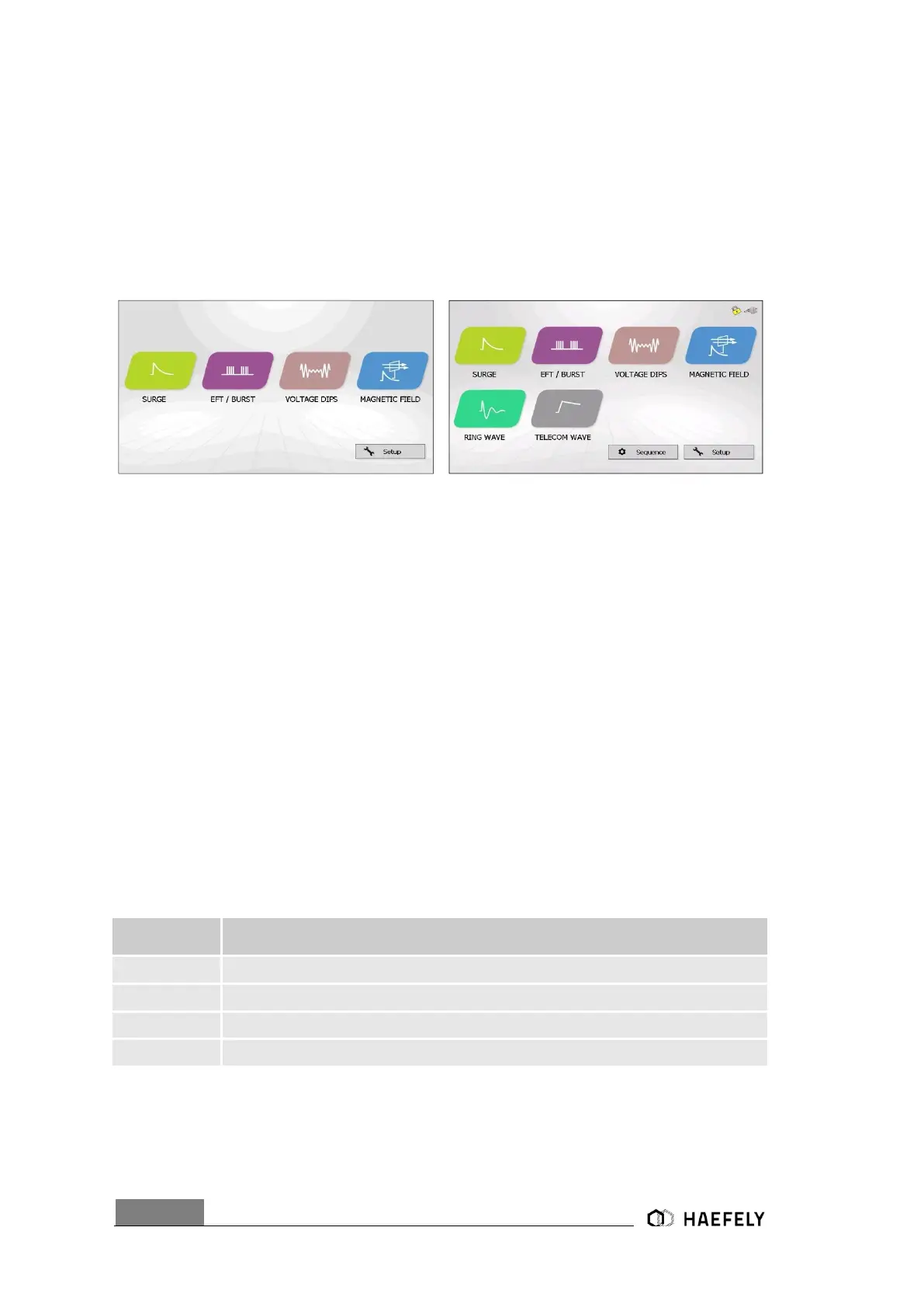 selected through the touch screen by pressing the corresponding icon (Surge, EFT/Burst, Voltage