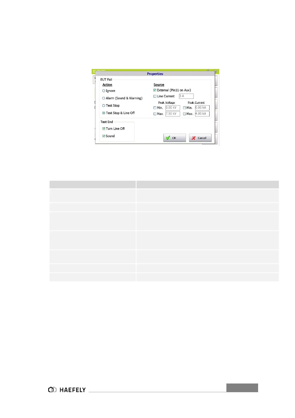 and causes an action (Ignore, Alarm, Test Stop or test stop & line off)