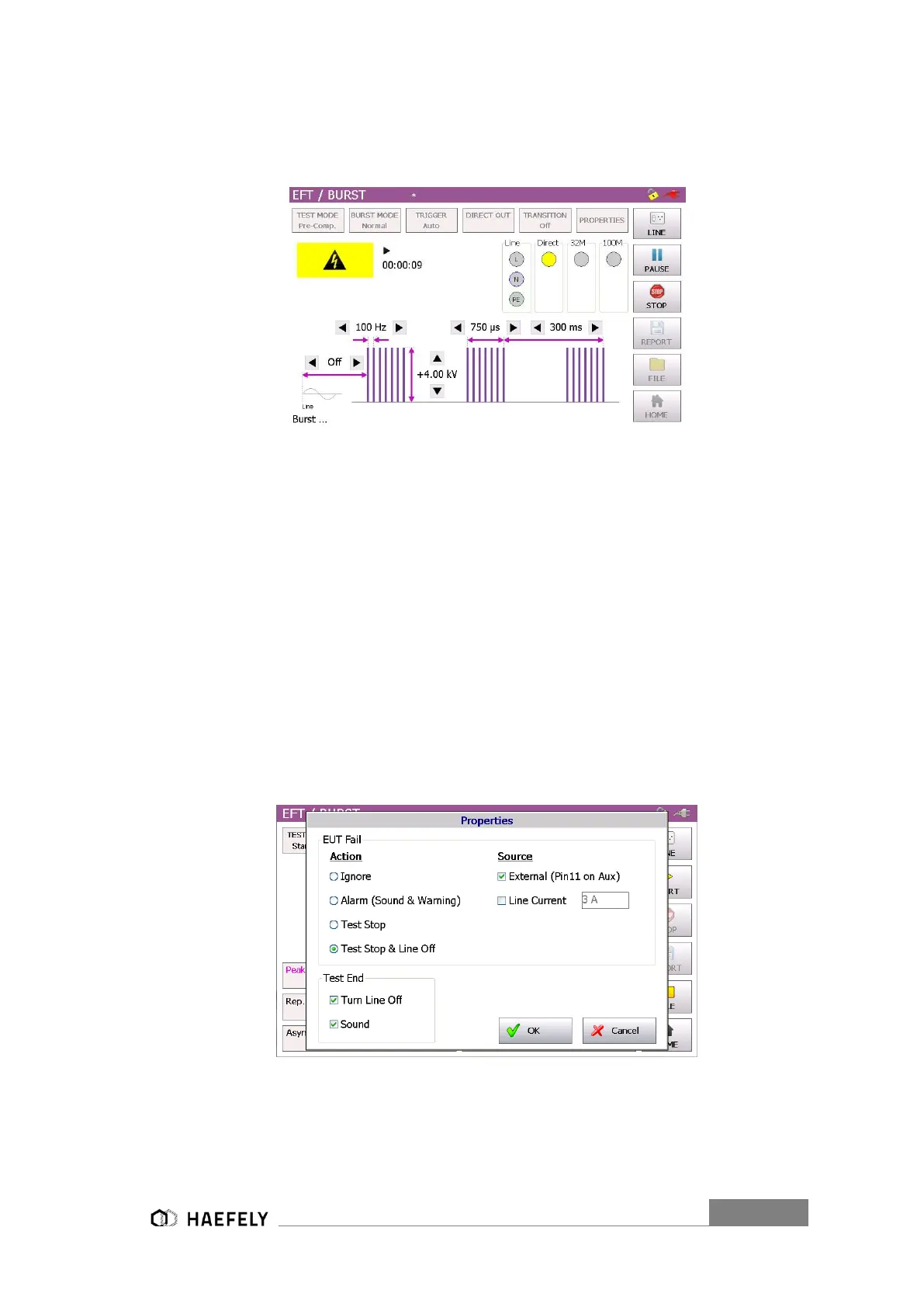 The Burst waveform gets stopped, when pushing the “Stop” button. Afterwards, test report can