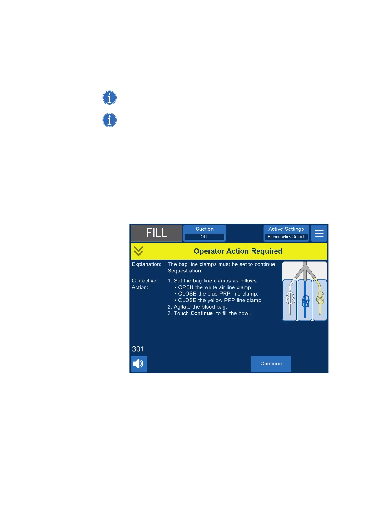 c. Touch Continue to start the Fill phase. The pump starts drawing blood.