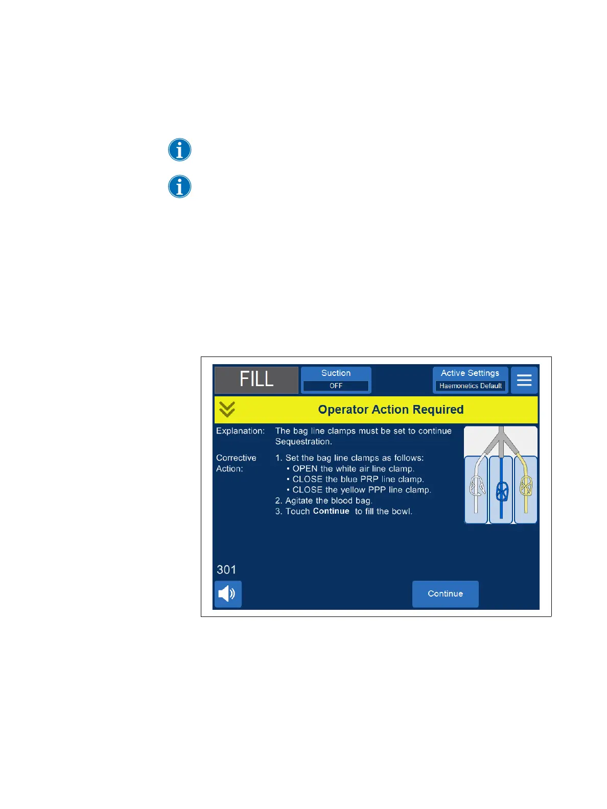 Note: The prompts below correspond to the Haemonetics default settings and