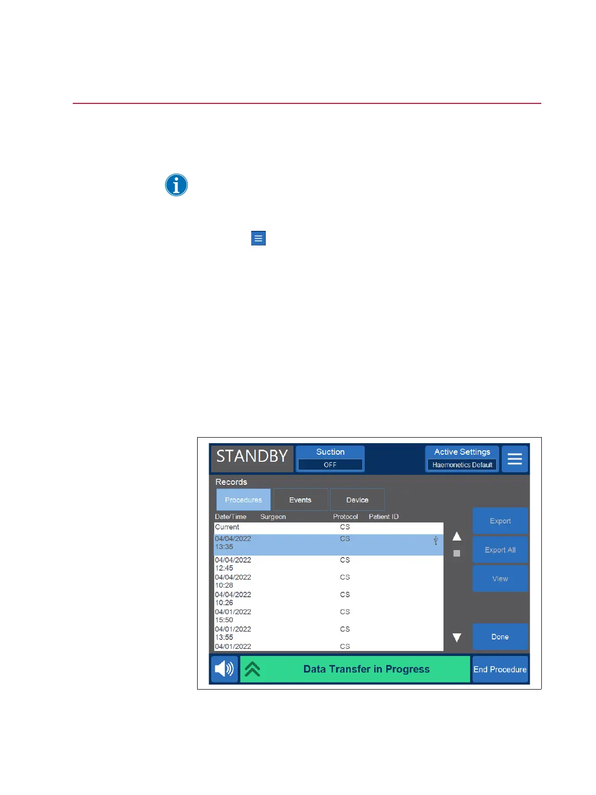 The Cell Saver Elite+ device allows you to export procedure records from the