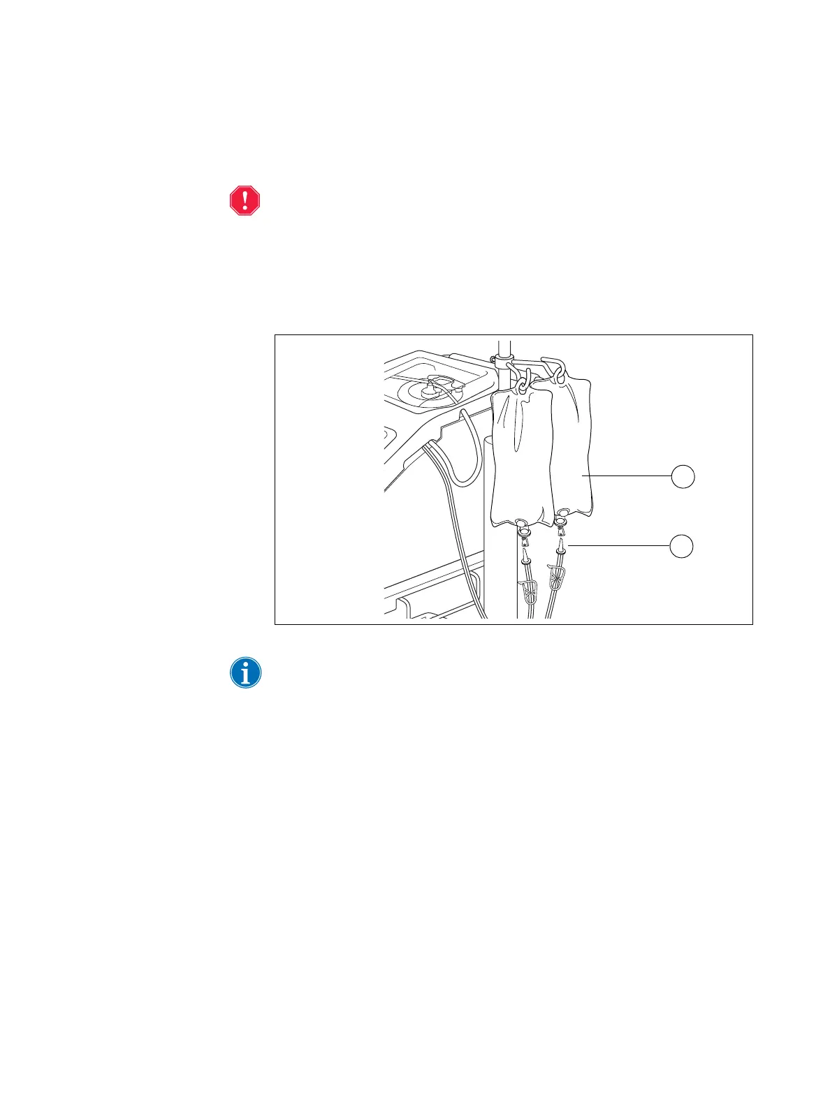 1. Hang the saline solution bags on the lower pigtail of the right IV pole.