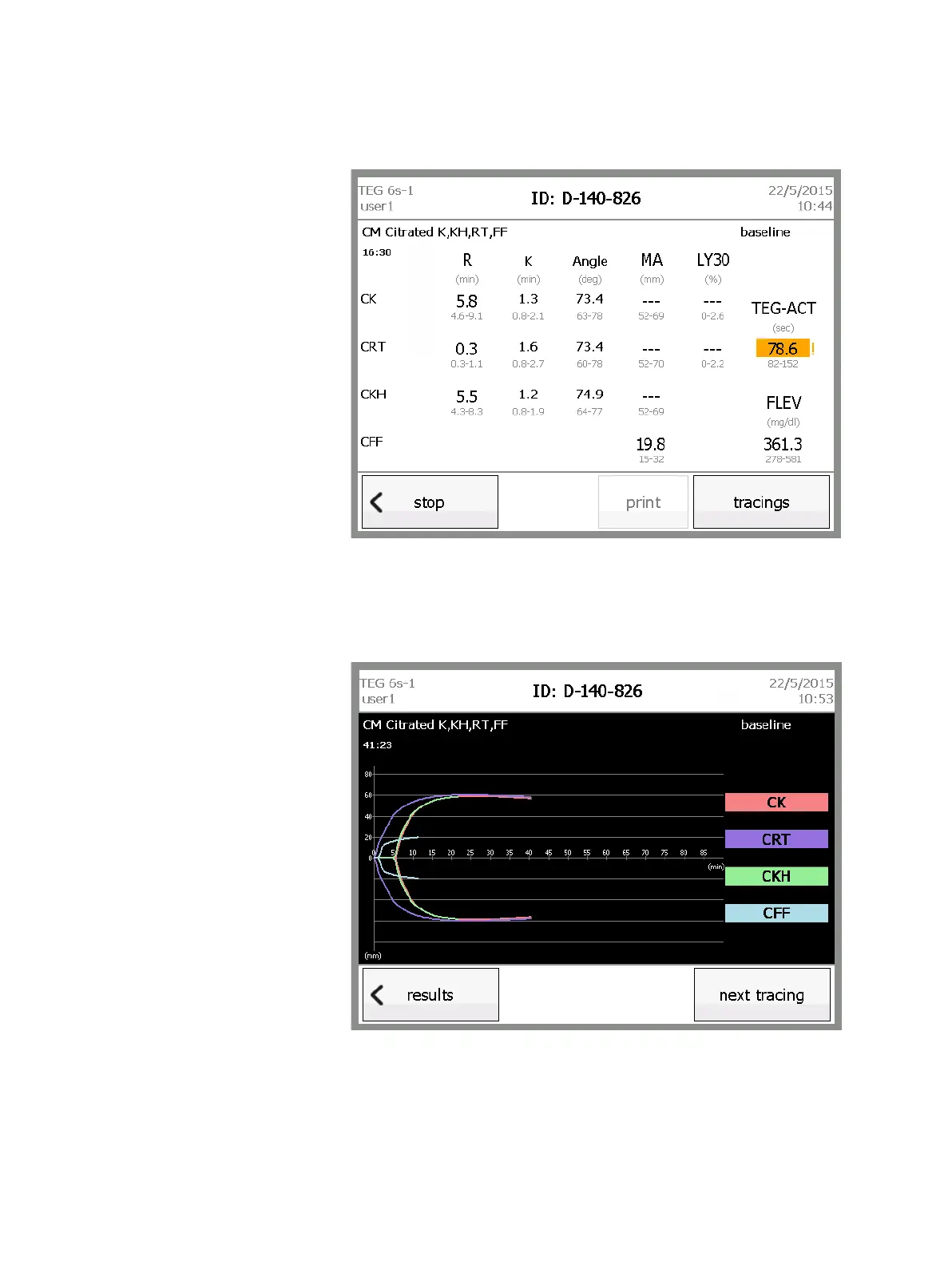 The TEG analyzer starts the test, and the results screen displays. Figure