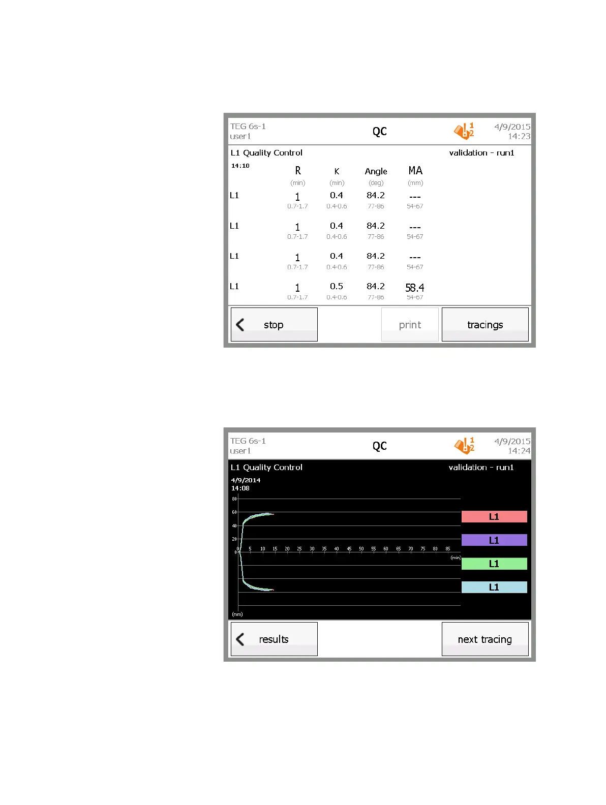 The TEG analyzer starts the QC test, and the results screen displays.