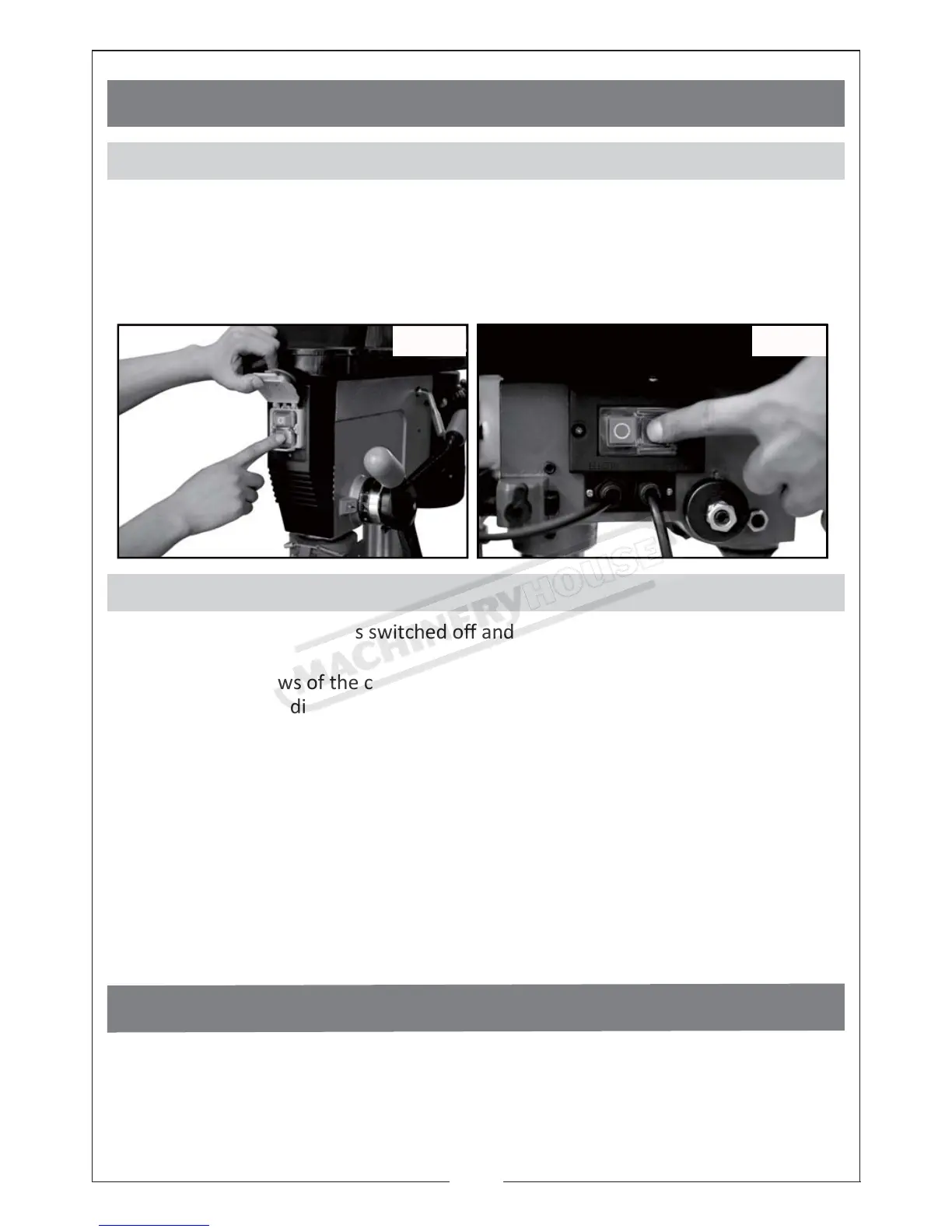 Switch the drill press On by pressing the green(I)buon on the switch