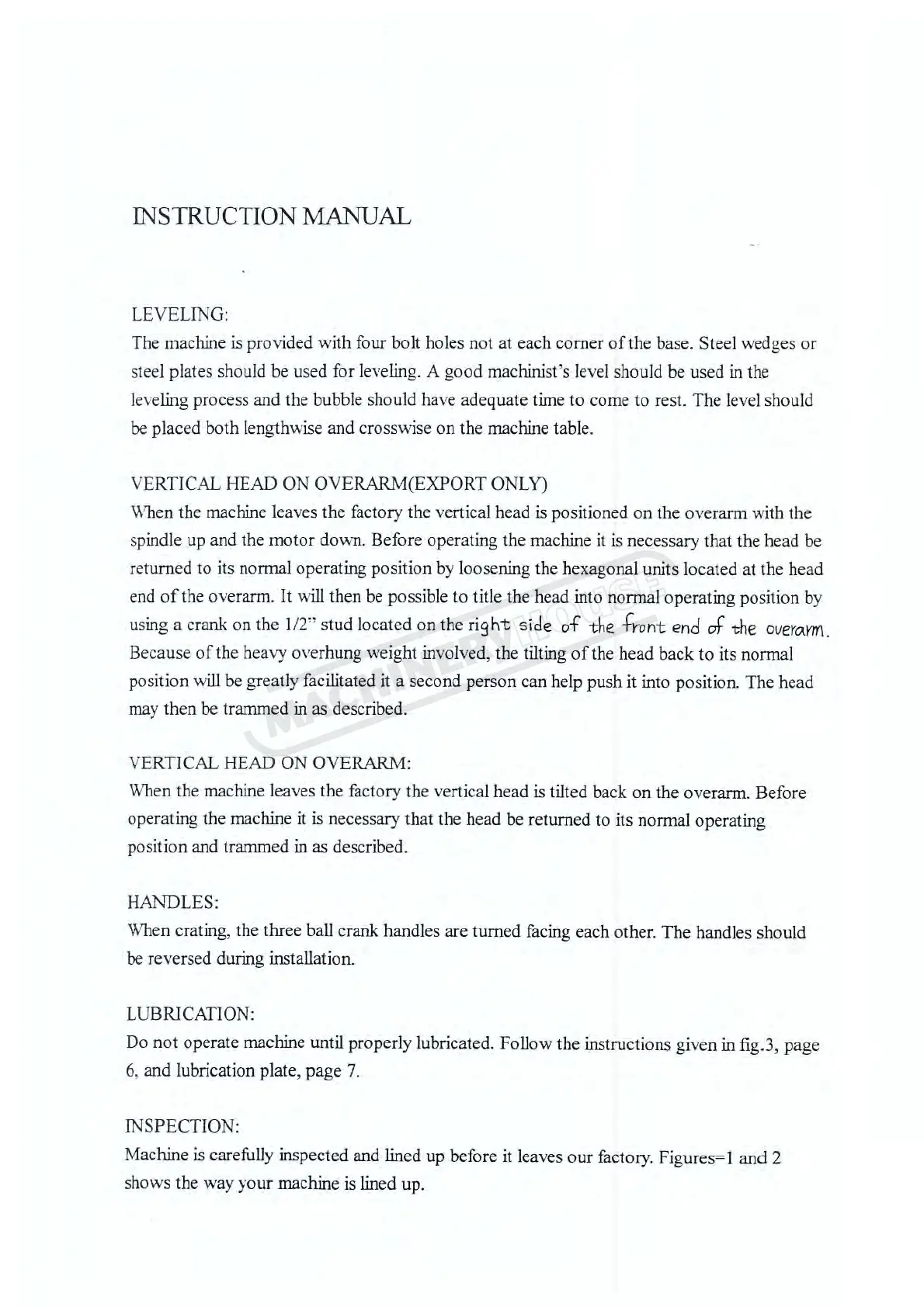 Hafco BM-70VE - Machine Installation and Preparation; Leveling and Head Positioning; Handle, Lubrication, and Inspection