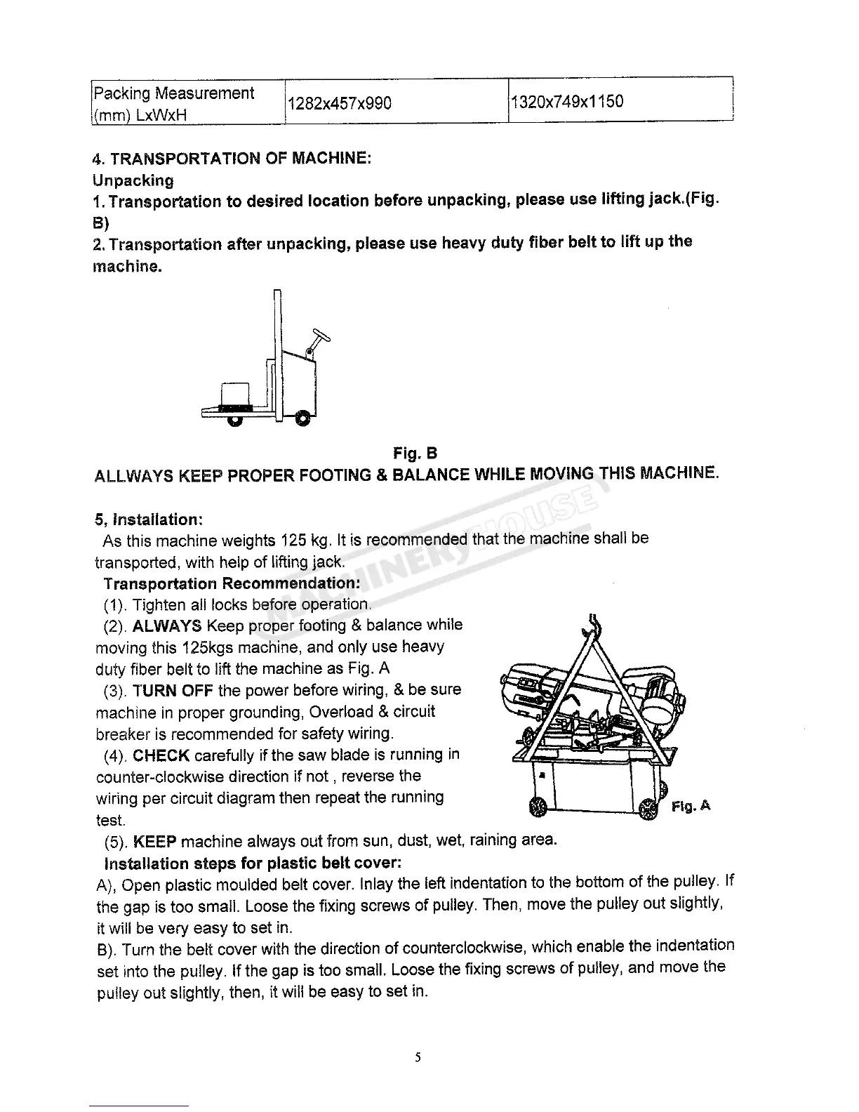 Hafco BS-7DS - 4. TRANSPORTATION OF MACHINE; 5. INSTALLATION AND SETUP GUIDE