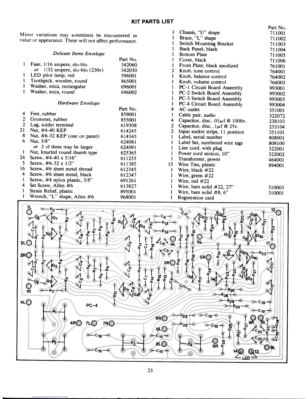 Hafler DH-101 - Kit Parts List; Delicate Items, Hardware, and Circuit Boards; Passive and Active Electronic Components; Miscellaneous Kit Components