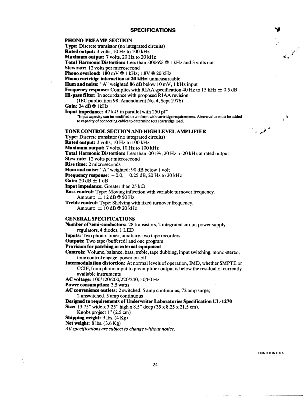 Hafler DH-101 - Technical Specifications; Phono Preamp Section Specifications; Tone Control and High Level Amplifier Specs; General Preamplifier and System Specifications