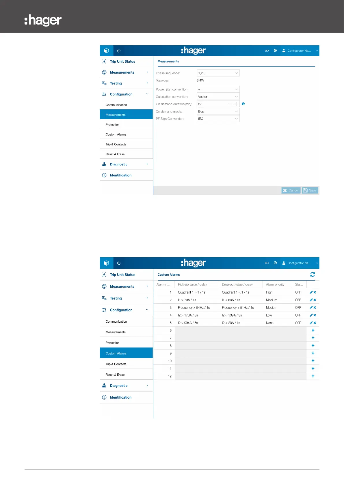 The Energy circuit breaker measurement parameters can be modified. The settings