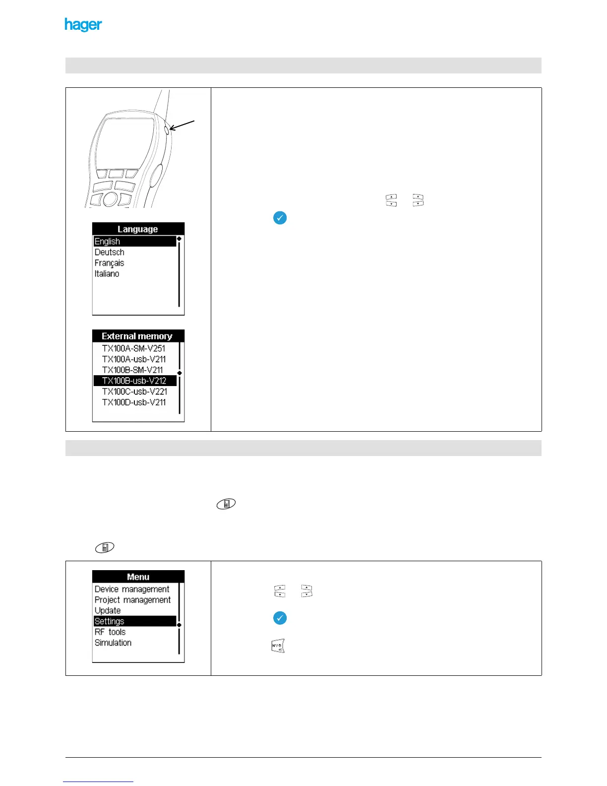 At the first start-up, the TX100 asks for the selection of the working language:
