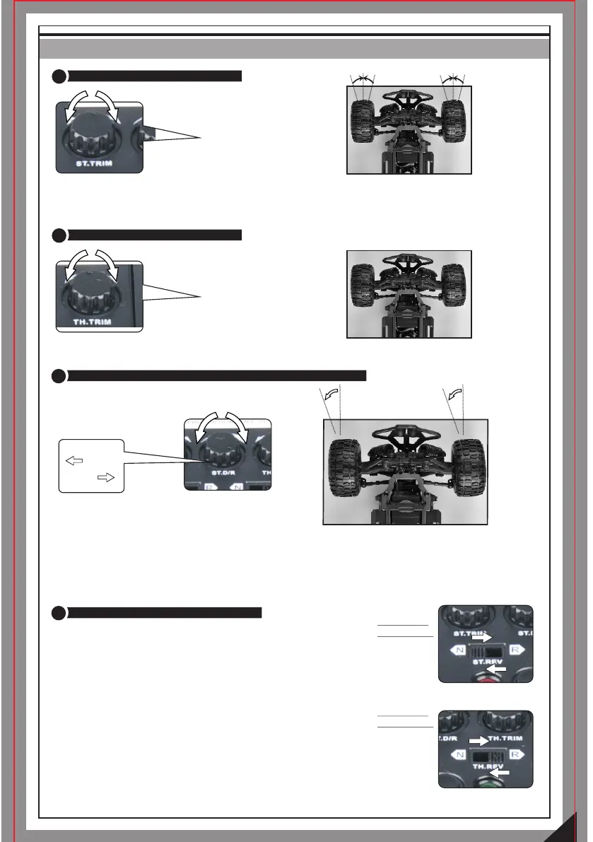 Gently pull the trigger to allow your car to run slowly. Meantime, tune the steering trim to allow the
