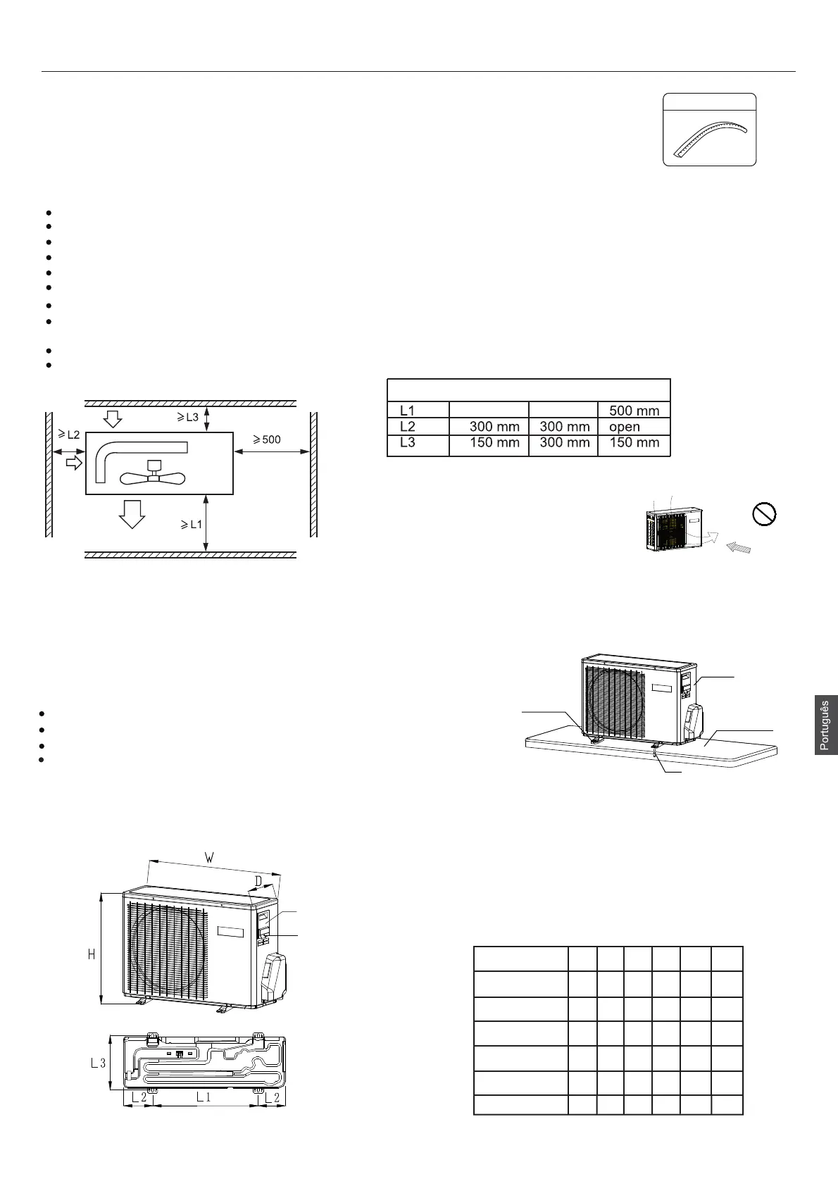 Local onde os quatro lados estão rodeados não são indicados para a instalação. 1m ou mais de espaço na parte