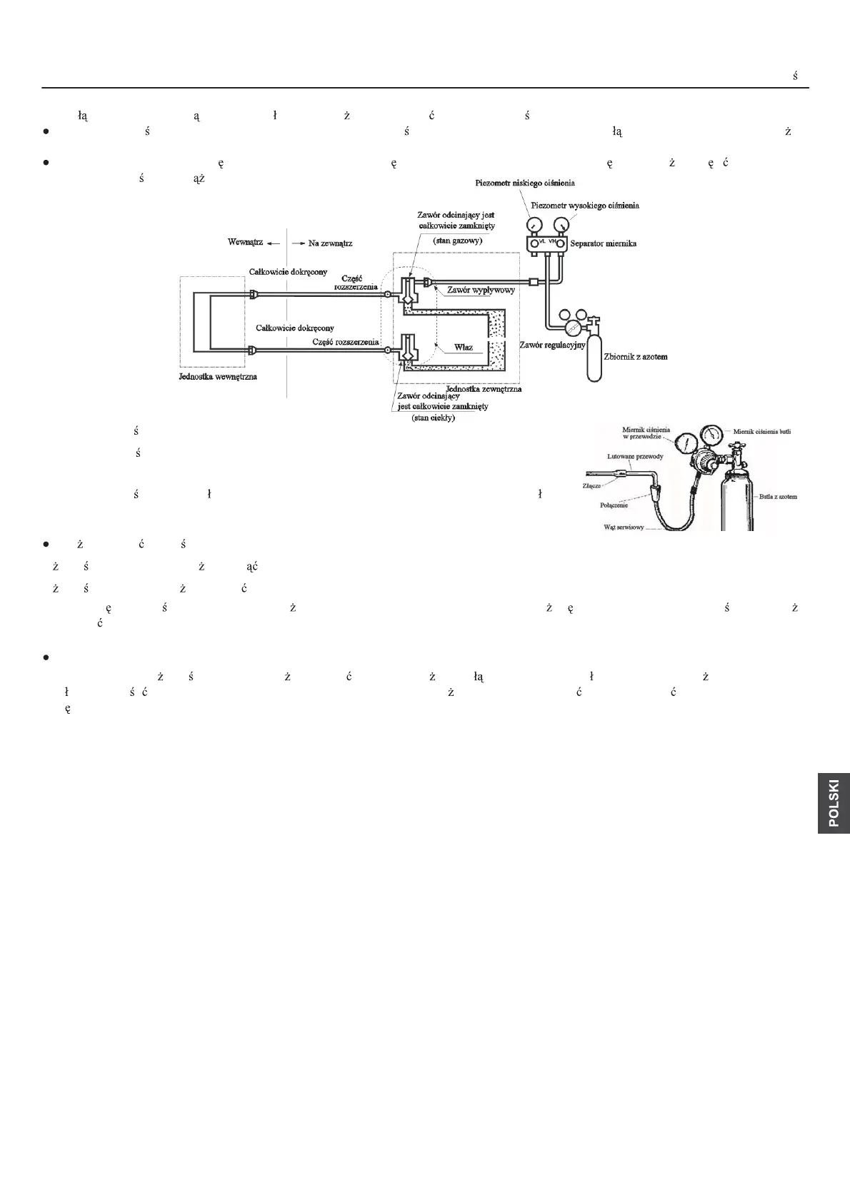 Zawór gazu i cieczy jest zamkni ty. Aby zapobiec przedostaniu si azotu do systemu obiegu jednostki zewn trznej, nale y dokr ci zawór przed
