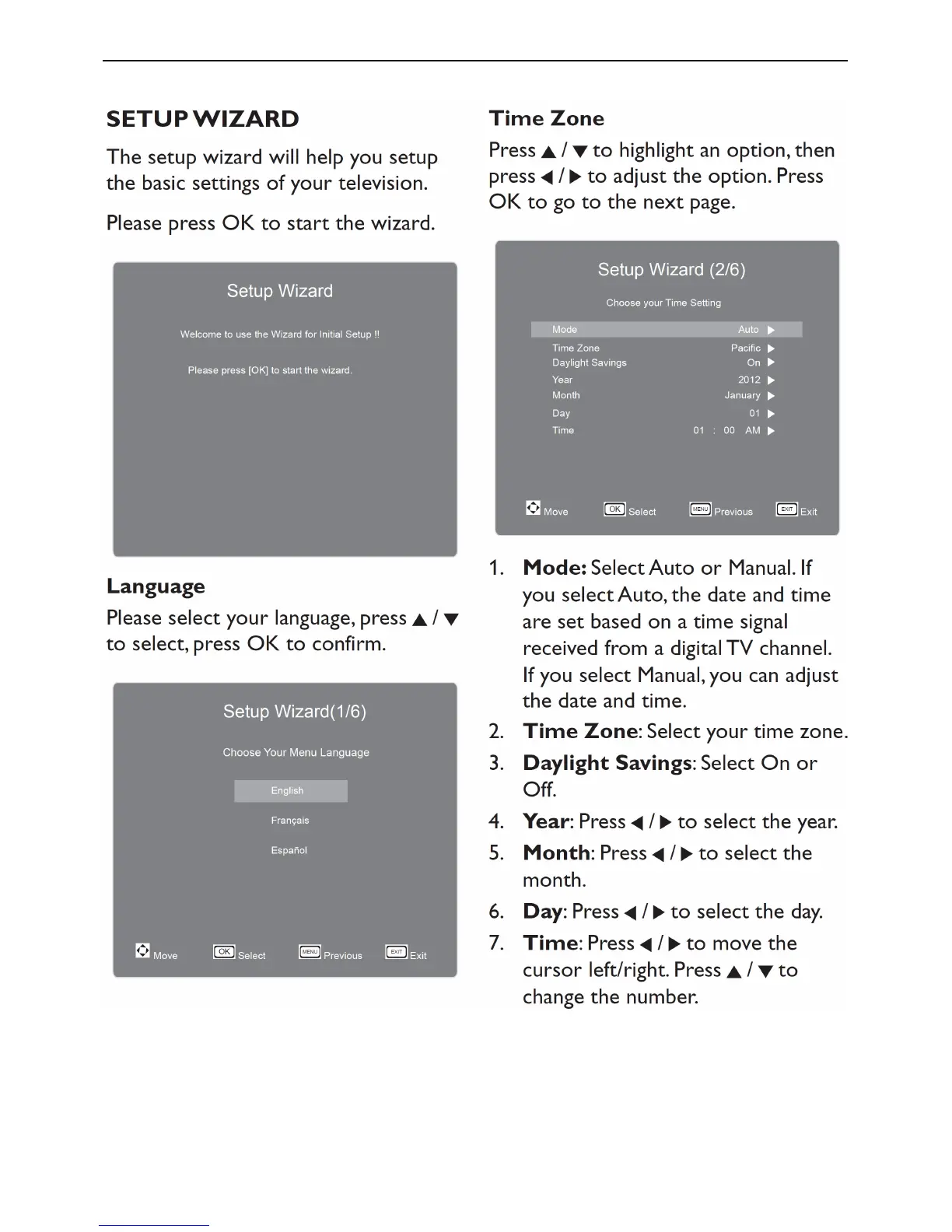 Haier 40D2500 - 2.2 OSD Menus; Setup Wizard Walkthrough; Language and Time Zone Setup