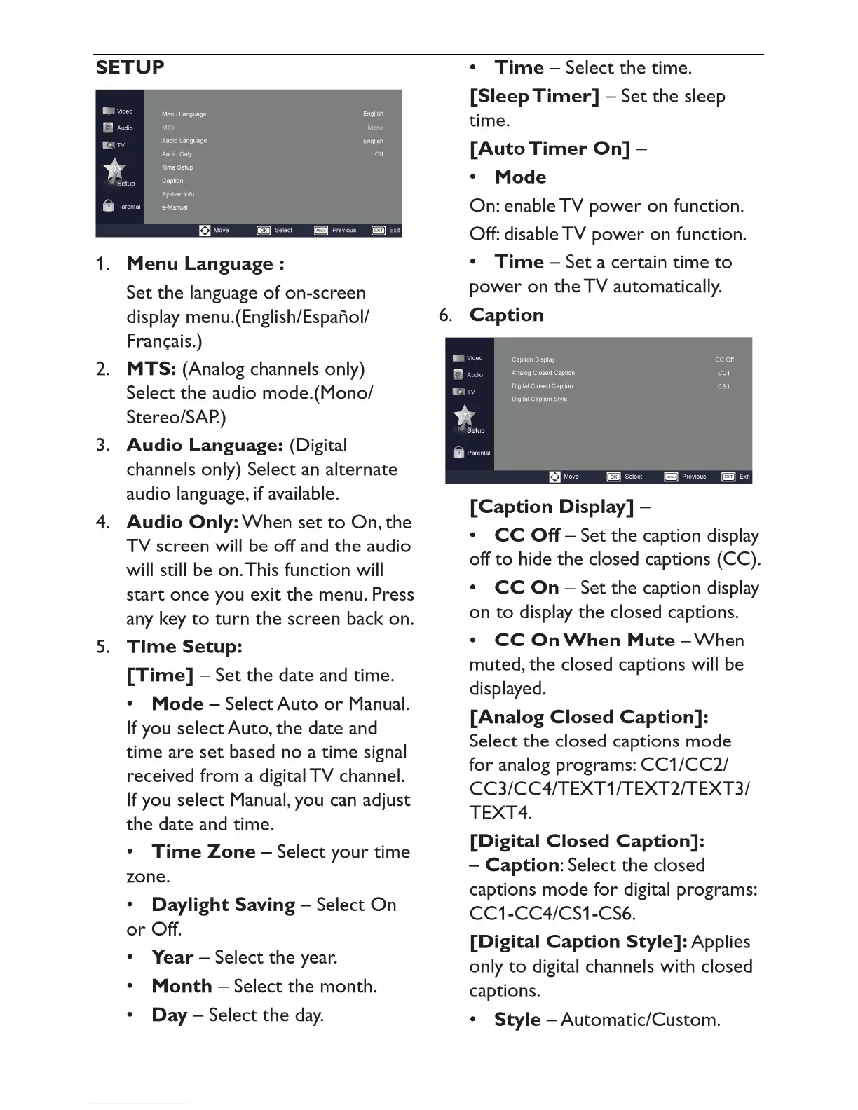 Haier 40D2500 - Setup Menu Options; Language, Time, and Caption Configuration