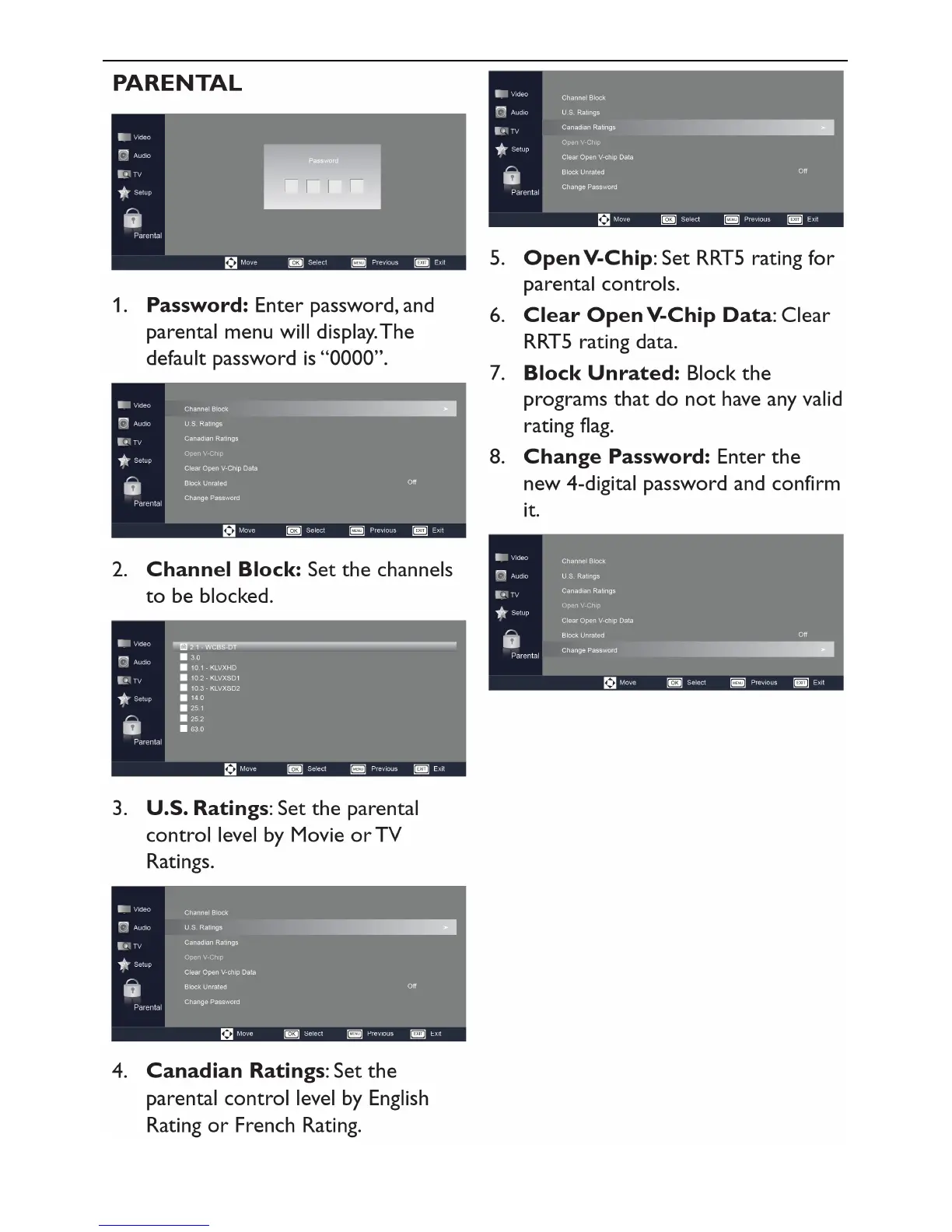 Haier 40D2500 - Parental Control Features; Password and Channel Blocking; Rating and V-Chip Settings; Password Change Function